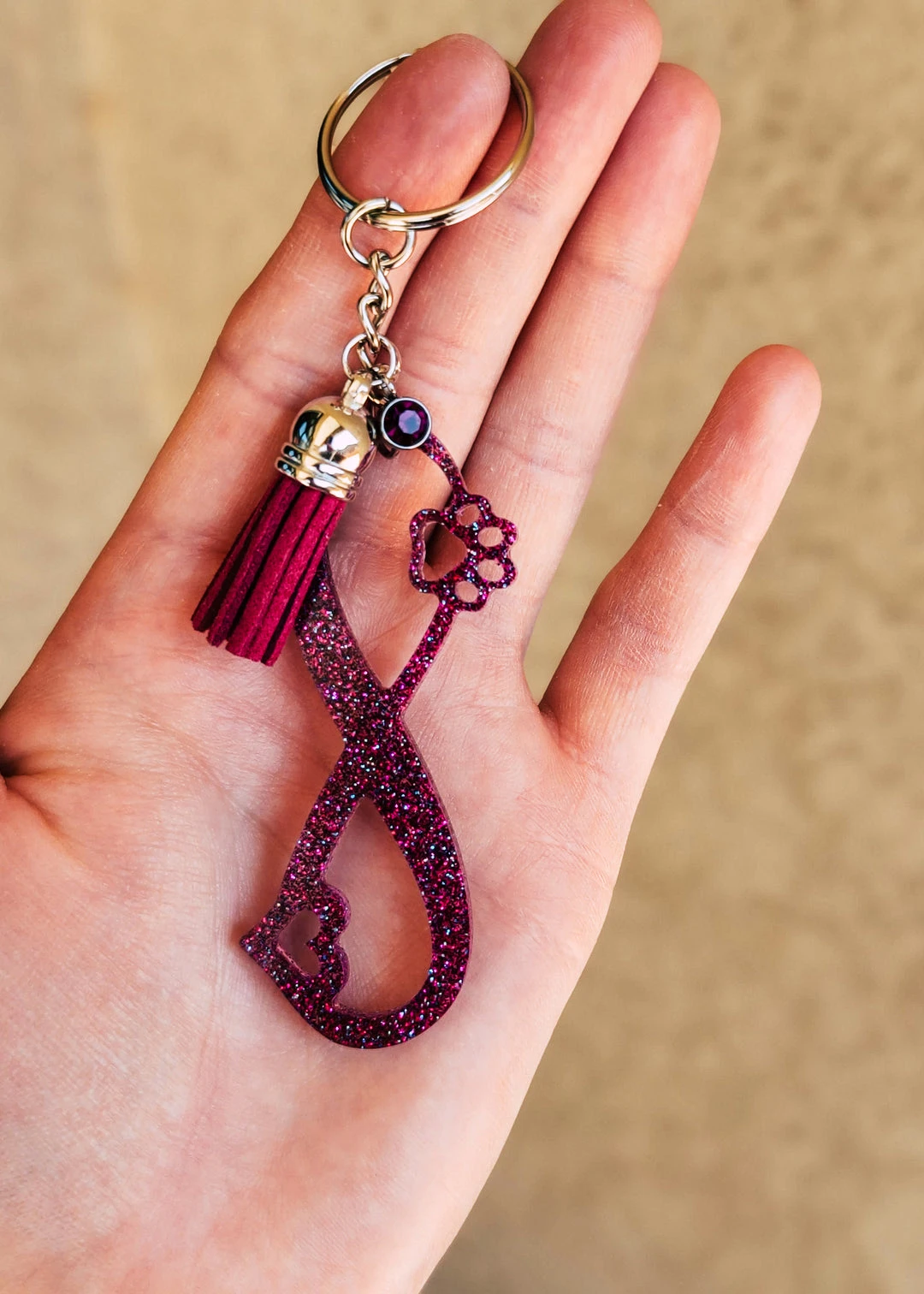 - Handcrafted with premium resin, this infinity keychain features vibrant magenta and turquoise colors, making it a standout accessory.