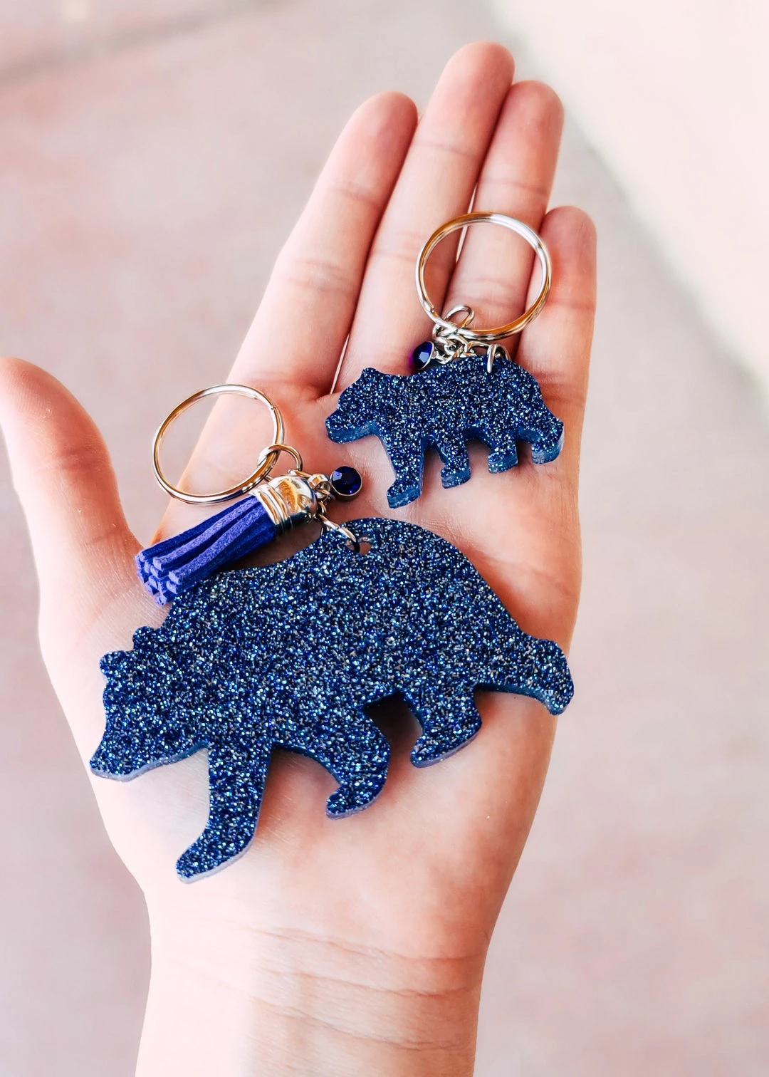 - The Cinchy Cowgirl Mama Bear & Baby Resin Keychain is a charming and durable accessory, crafted with high-quality resin in a beautiful blue and silver design.