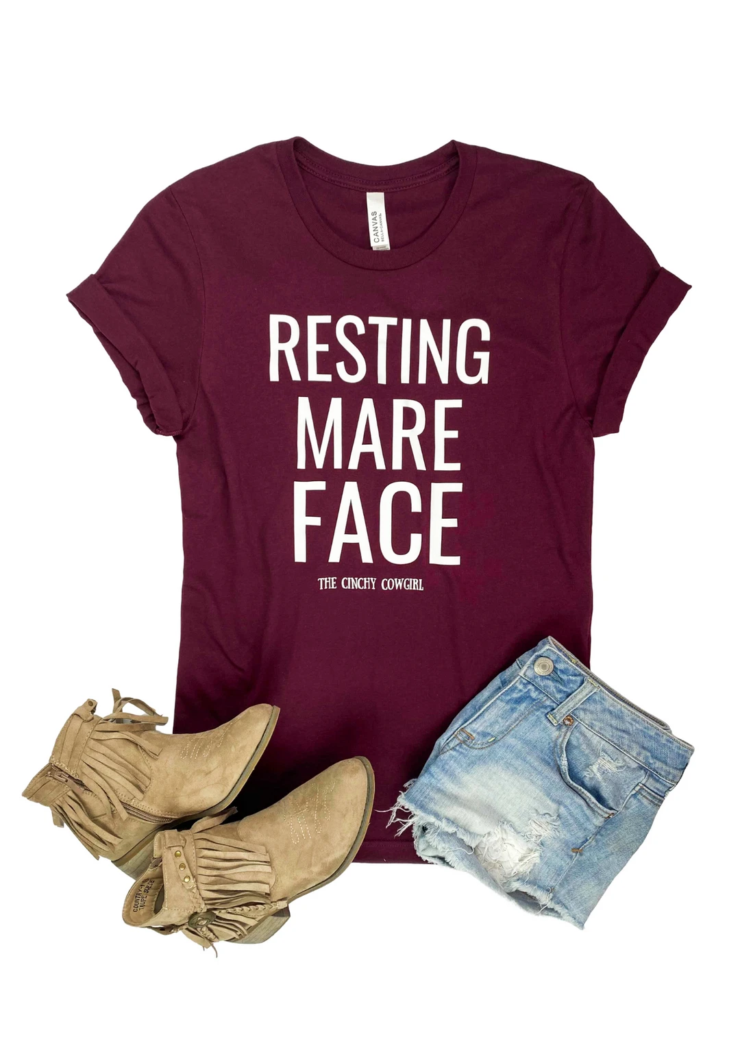 - Elevate your casual wardrobe with the Cinchy Cowgirl Maroon Resting Mare Face Graphic Tee. This short-sleeve t-shirt features a unique and eye-catching design that’s perfect for everyday wear.