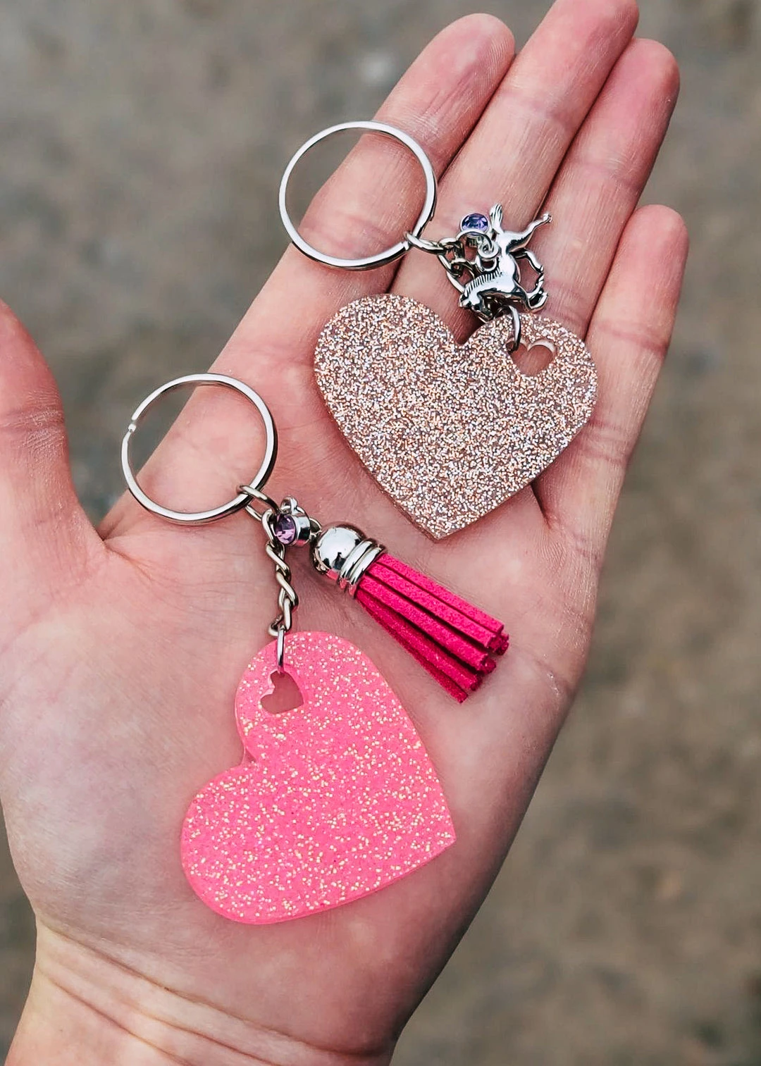 - Elevate your everyday style with the Cinchy Cowgirl Pink & Champagne Heart Keychain Set of 2. These resin keychains feature a unique heart design in pink and champagne tones, perfect for adding a feminine touch to your keys or bag.