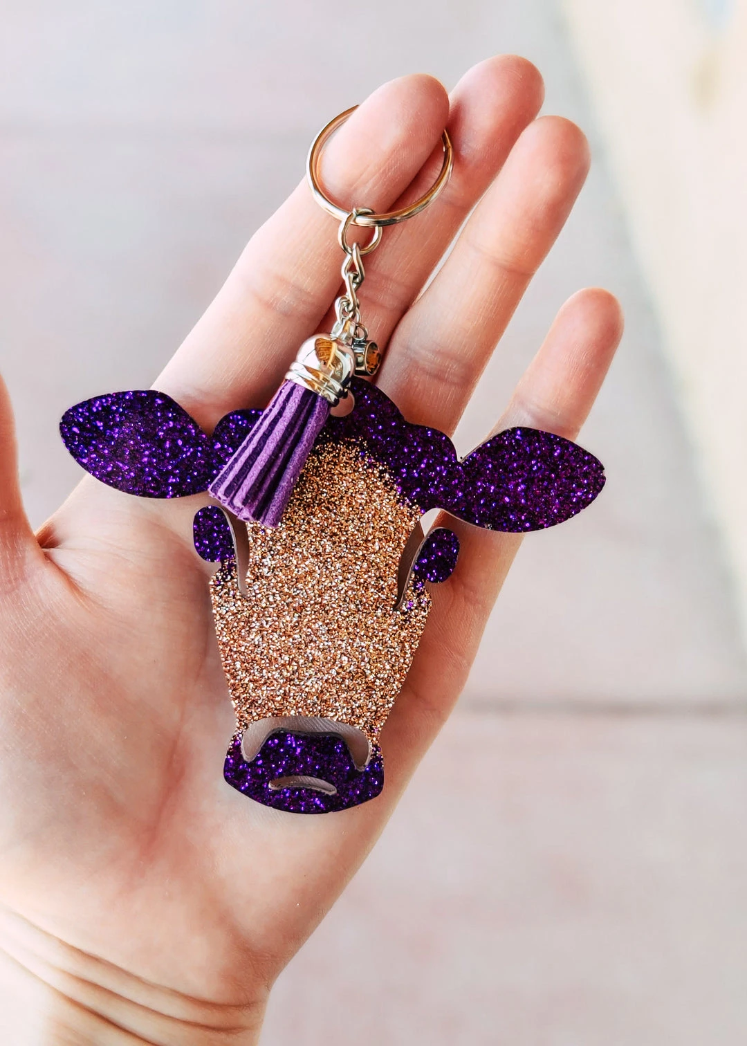 - Handcrafted with premium resin, the Cinchy Cowgirl Cow Head Keychain features a charming purple & champagne design, making it a standout accessory.
