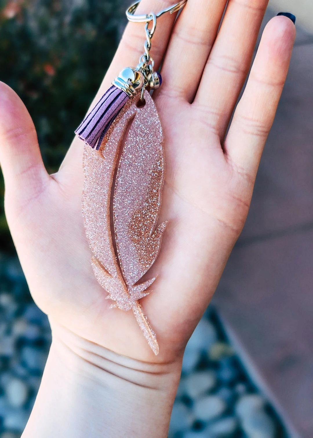 - Elevate your style with the Cinchy Cowgirl Resin Keychains featuring a chic champagne feather design. Ideal for adding flair to your keys or bag.