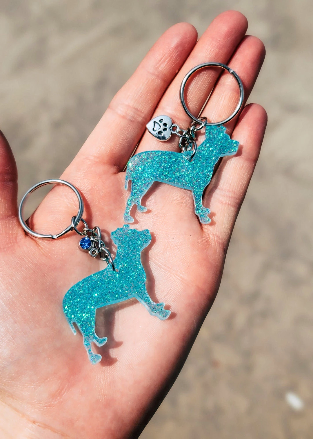- Handmade Resin Keychains – Each set includes two unique Turquoise Pitbull Minis, meticulously crafted with high-quality resin for durability and charm.