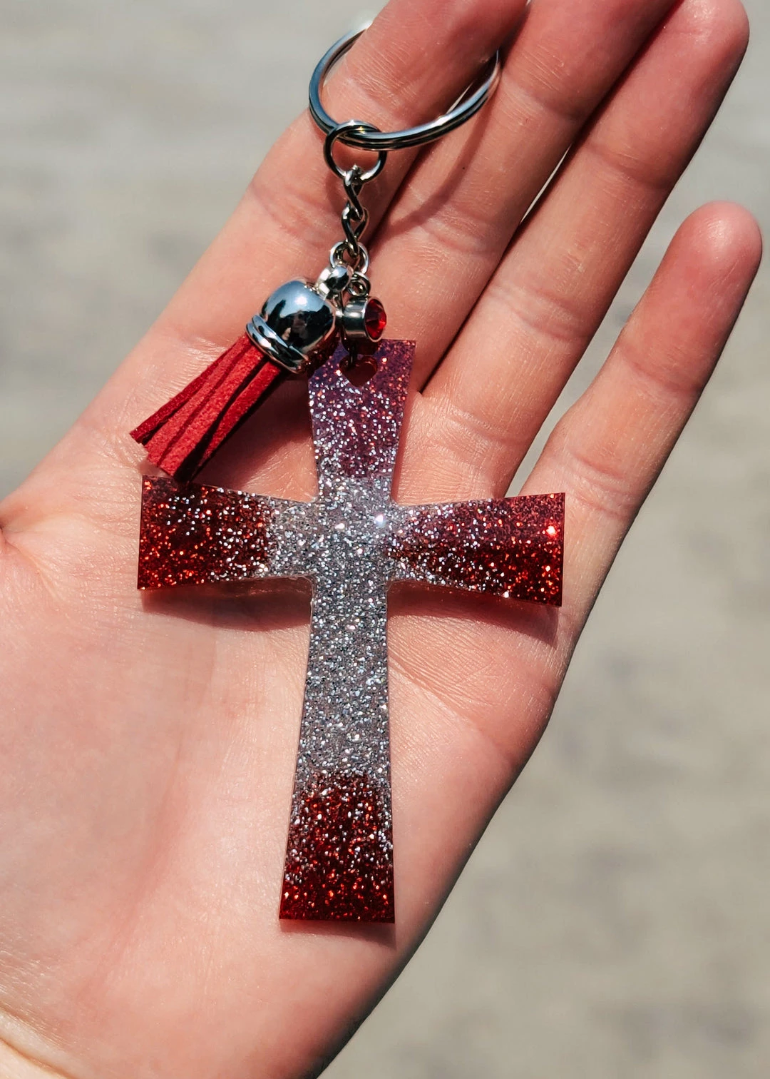 - The Cinchy Cowgirl Silver & Red Cross Resin Keychain is a stylish and unique accessory that adds a touch of personality to your keys, bags, or jackets.