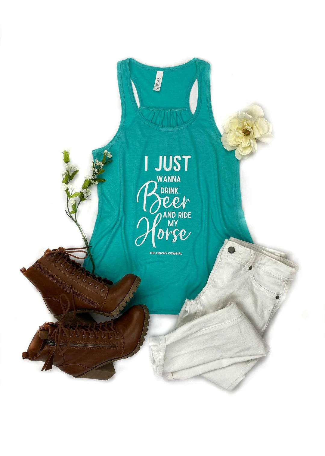 - Express your cowgirl style with the Cinchy Cowgirl Teal Graphic Tank Top. Featuring a bold ‘Drink Beer & Ride My Horse’ design, this tank is perfect for casual outings, rodeos, or a day at the ranch.