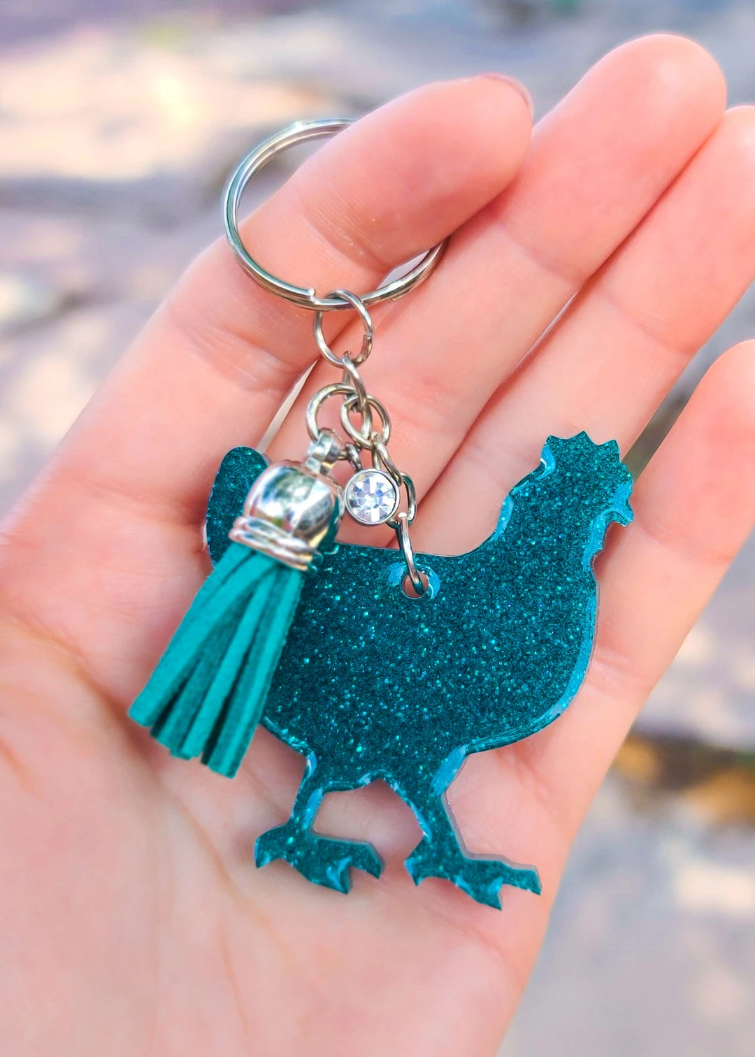 - Vibrant Design: Features a teal glitter finish on a charming chicken silhouette, making it a standout accessory.