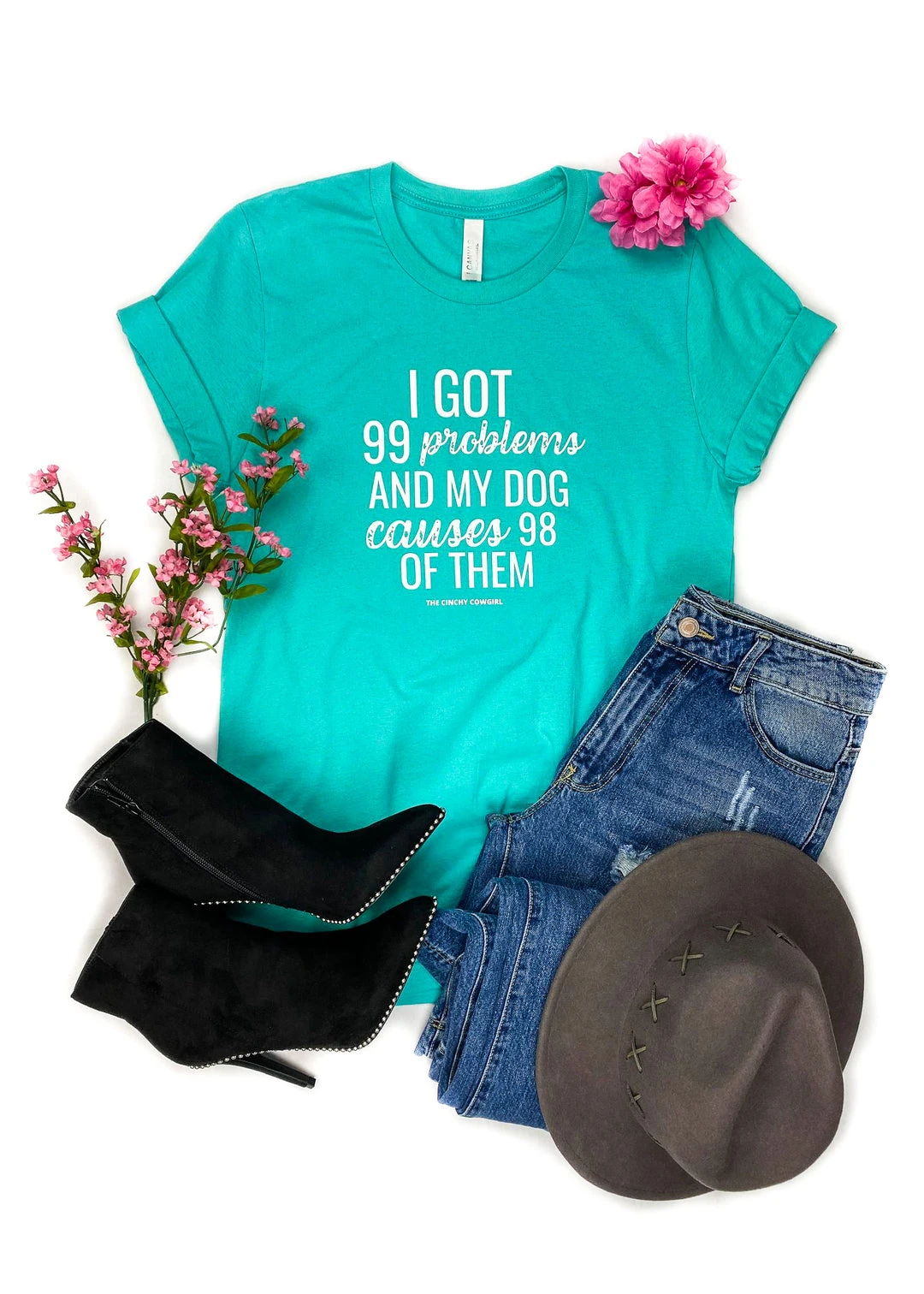 - Express your love for dogs with the Cinchy Cowgirl Teal Problems Dog Short Sleeve Tee. This graphic tee features a playful and unique design that’s perfect for casual outings or lounging at home.