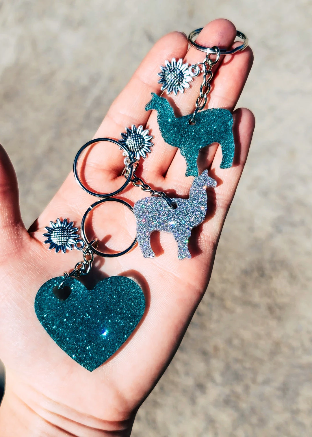 - The Cinchy Cowgirl Teal & Silver Mini Llama & Heart Resin Keychain Set of 3 features intricate designs with vibrant colors, making it a unique and eye-catching accessory.