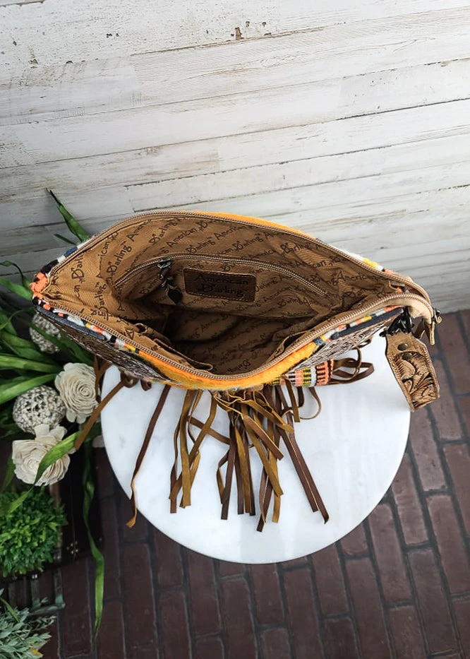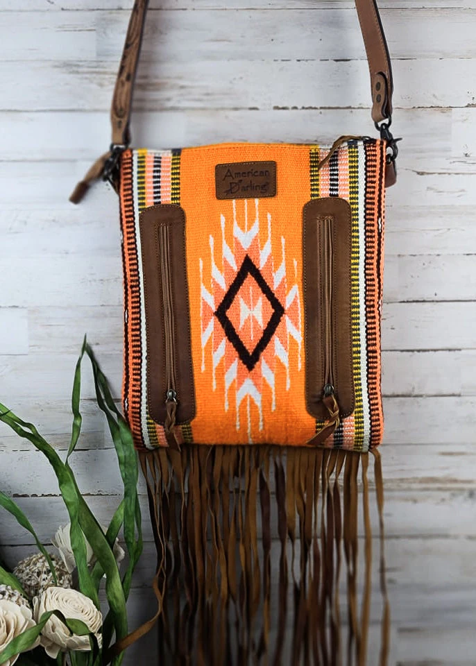 - The American Darling Concealed Carry Orange Aztec Fringe Handbag combines fashion with functionality, featuring a unique Aztec design with vibrant orange coloring. A perfect accessory for a bold, secure, and stylish look.
