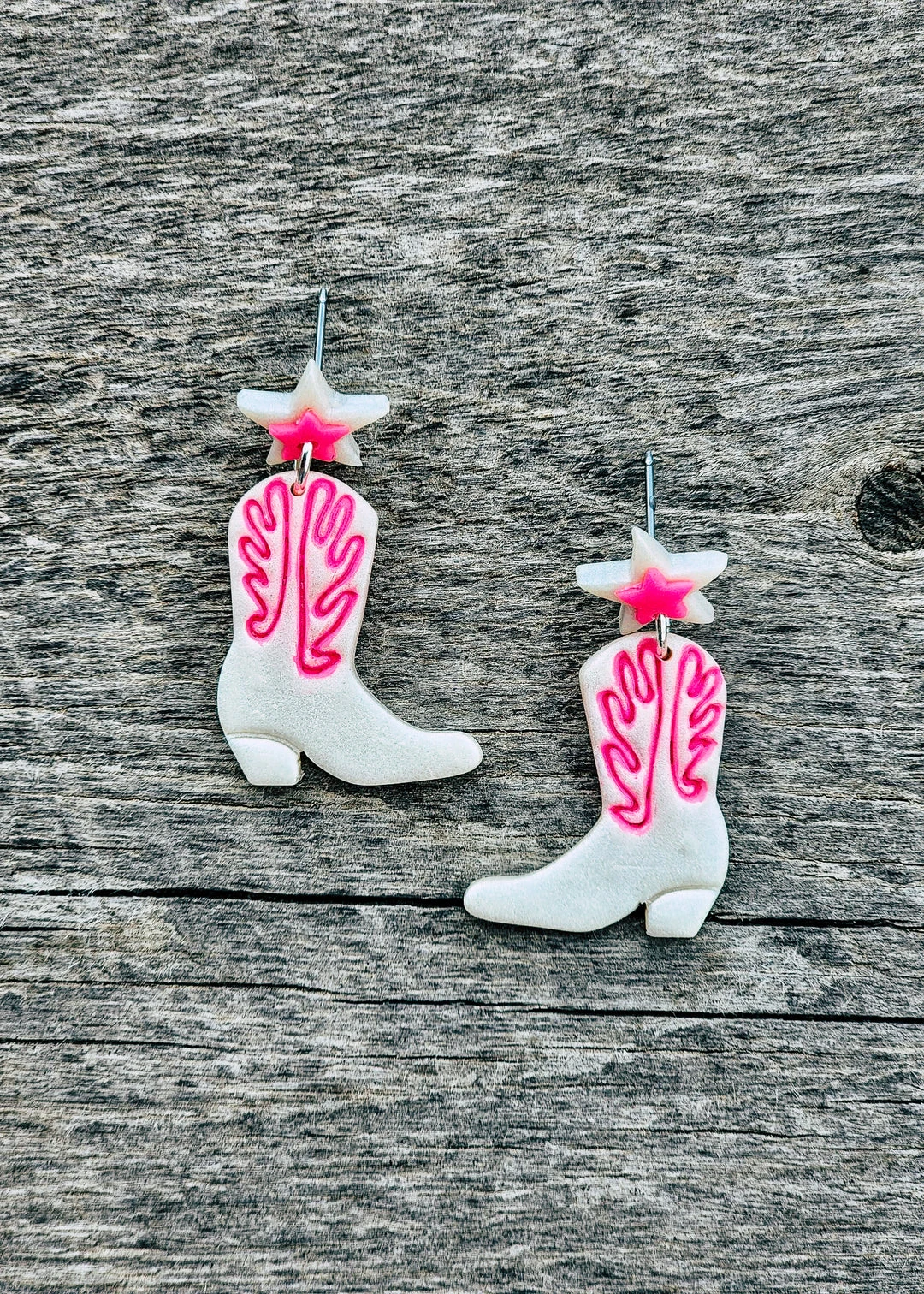 - Handcrafted clay earrings featuring a stylish cowboy boot design in white and pink tones.