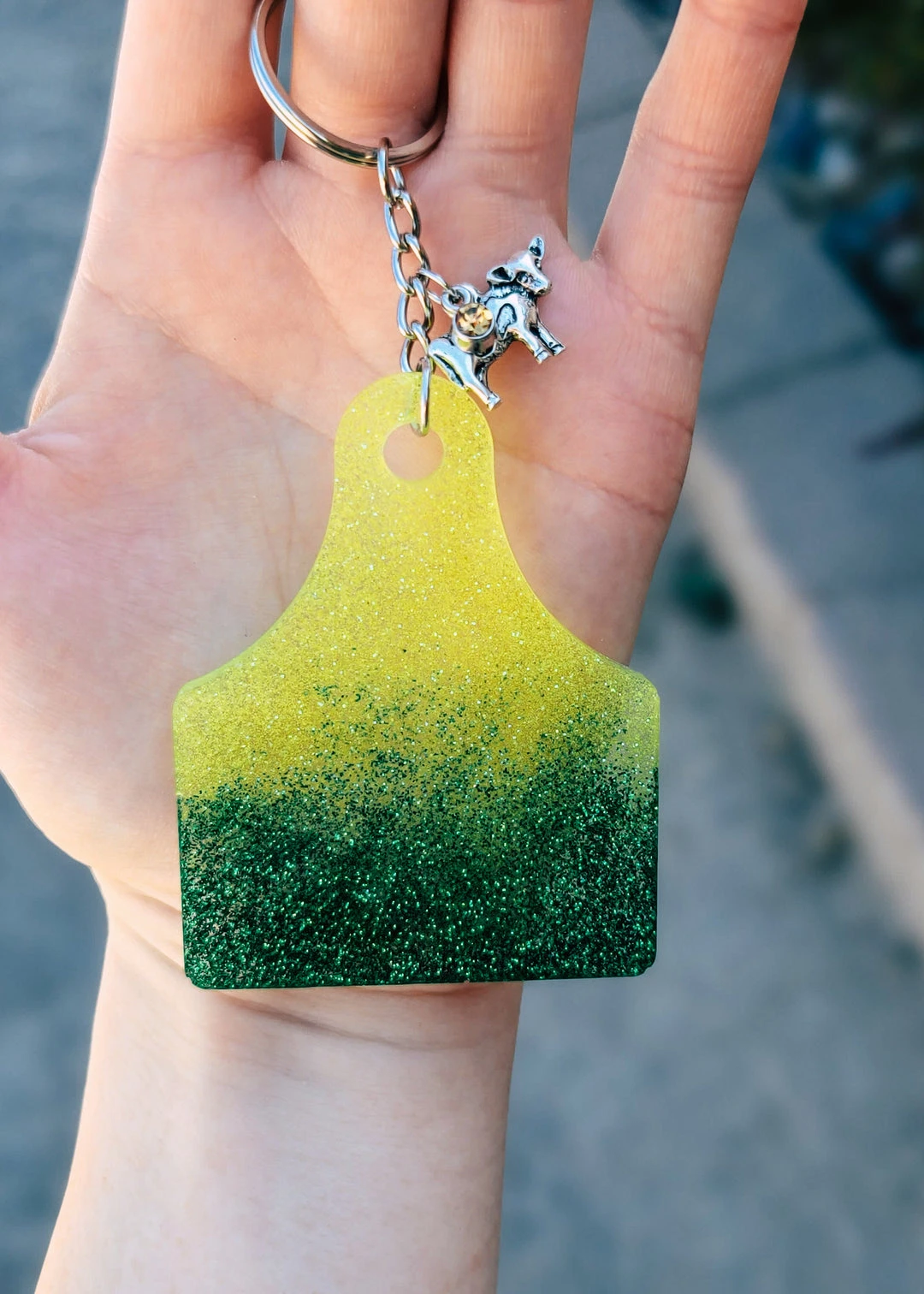 - Unique and stylish, this Green & Yellow Resin Ear Tag Keychain is a must-have accessory for every cowgirl. Perfect for adding a touch of western charm to your everyday look.
