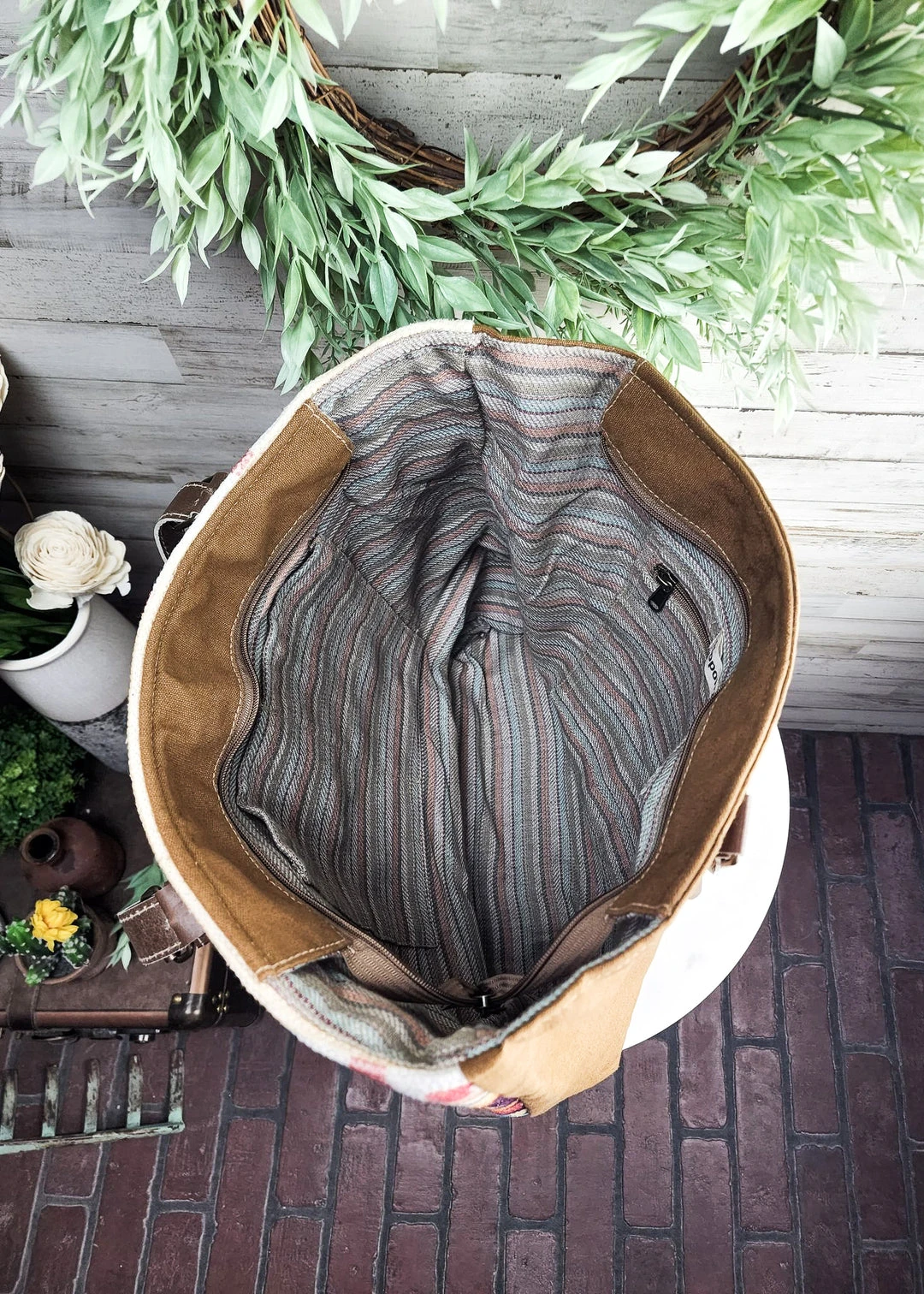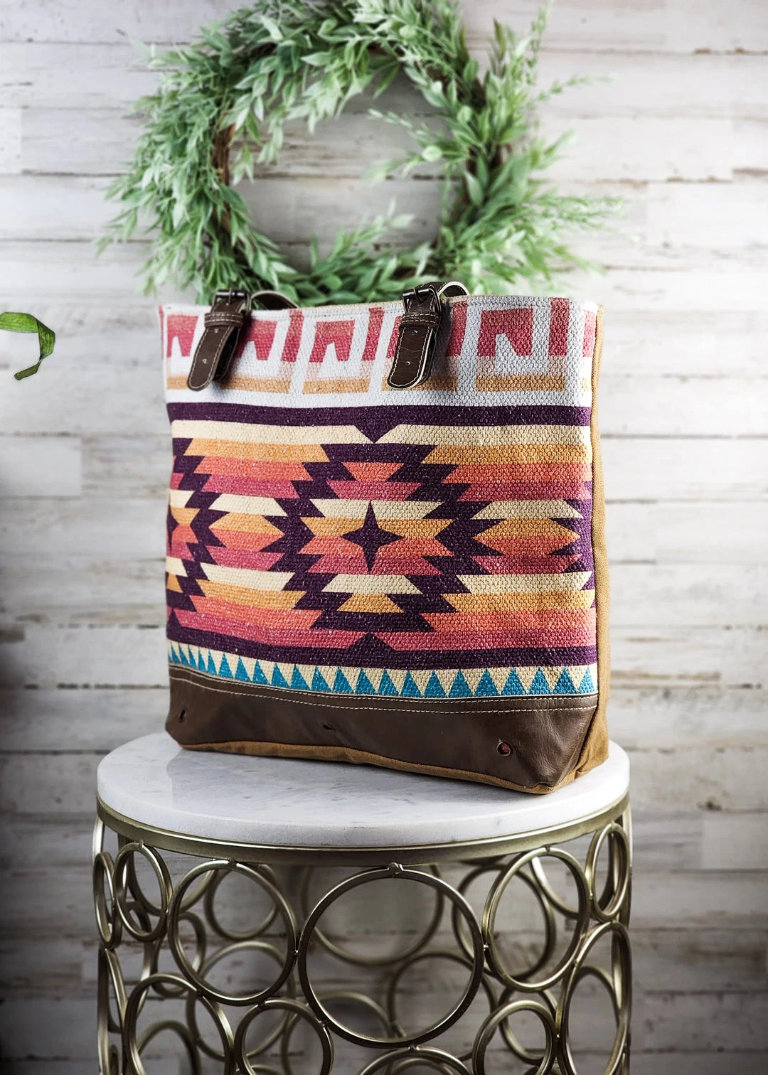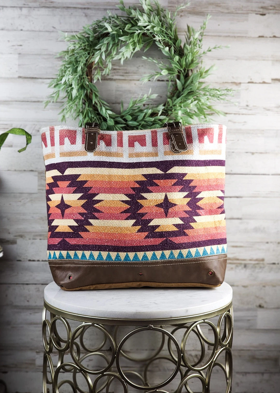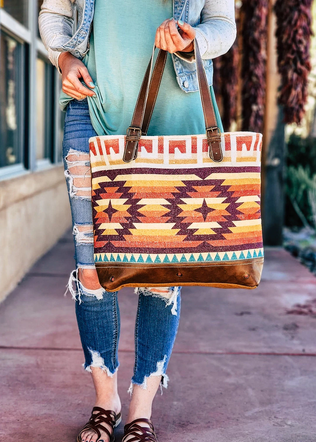 - Available in a stunning Sunlit Scenery Aztec design, this tote bag adds a pop of color to any outfit, making it a versatile accessory for any occasion.