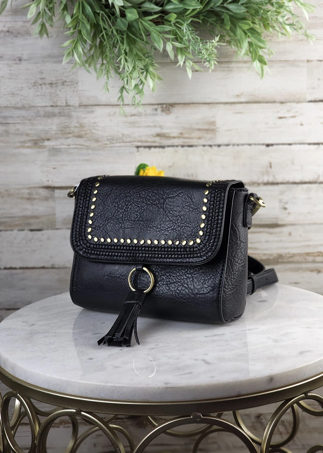 - Elevate your accessory game with the Jen & Co Black Studded Crossbody Handbag, featuring a trendy studded design and a sleek, black finish. Perfect for casual outings or evening events.