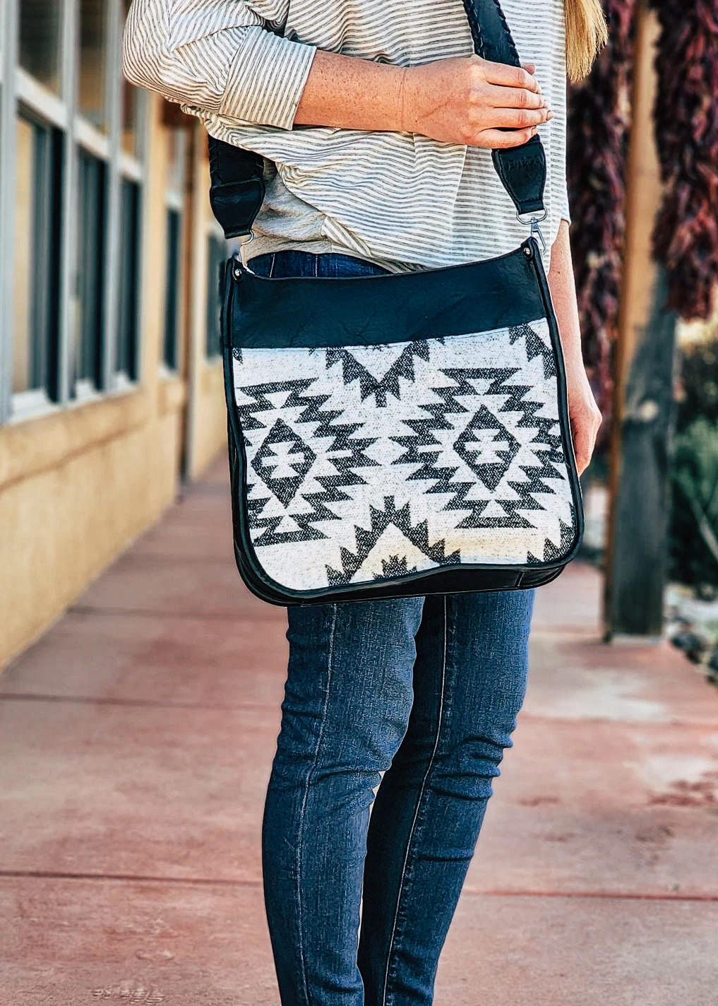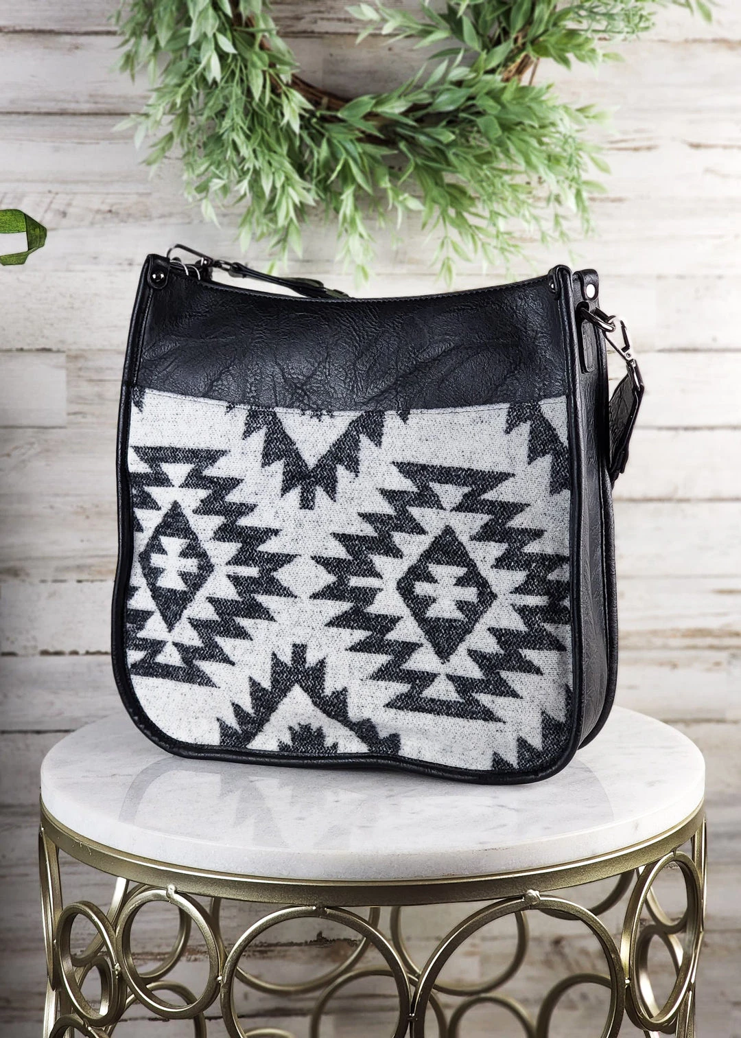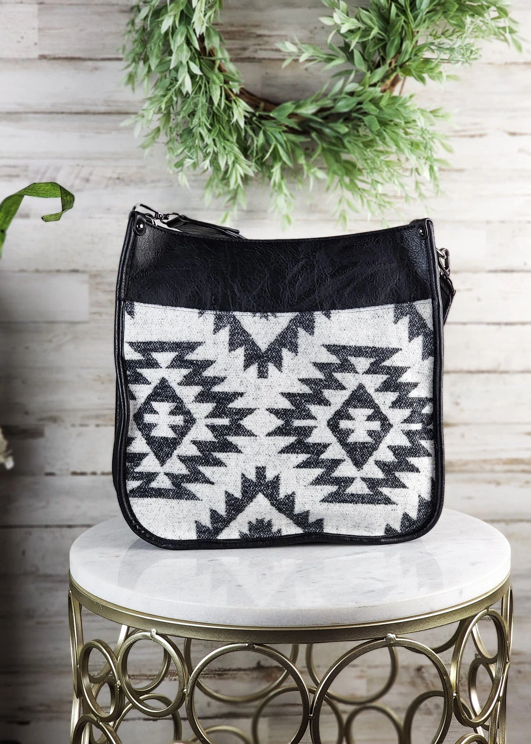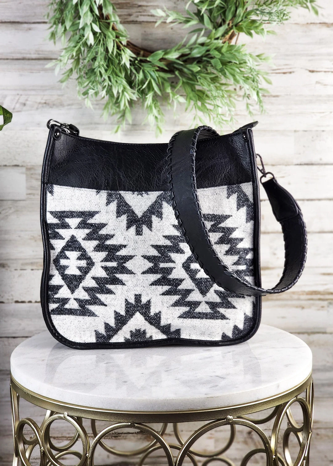 - Elevate your style with the Jen & Co Black & White Aztec Crossbody Handbag. Featuring a striking Aztec design, this handbag is both trendy and timeless.