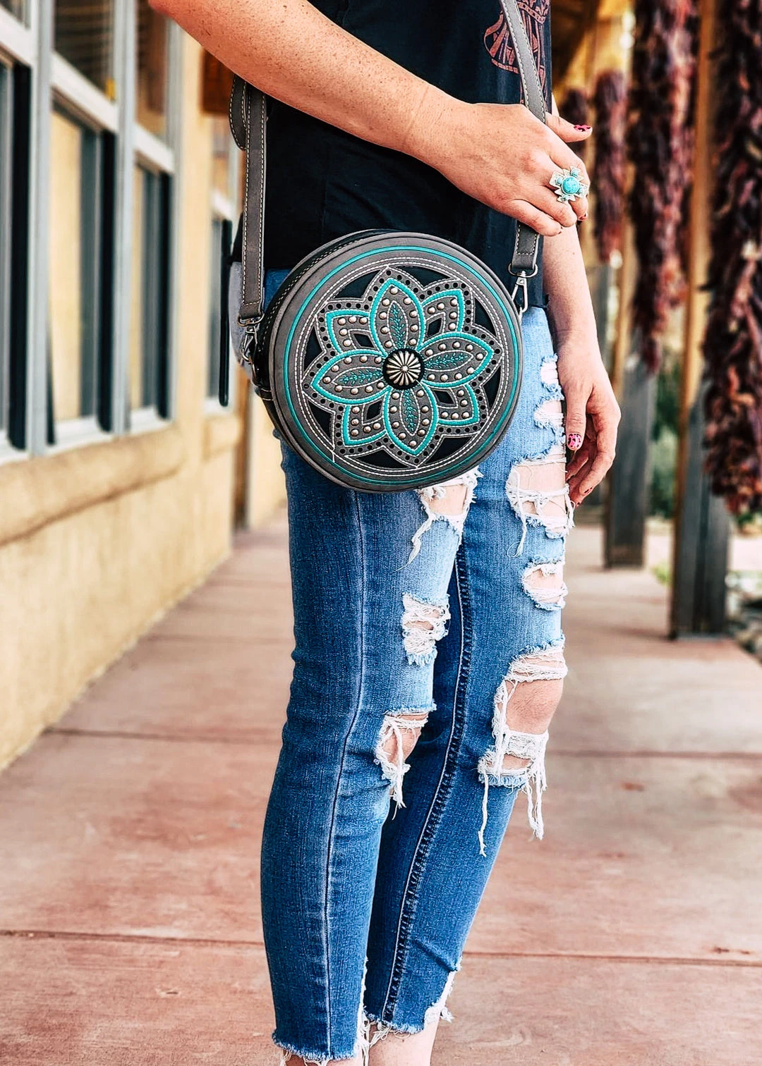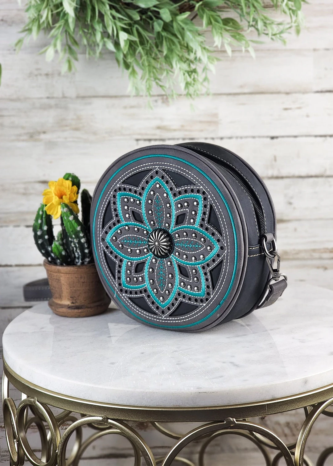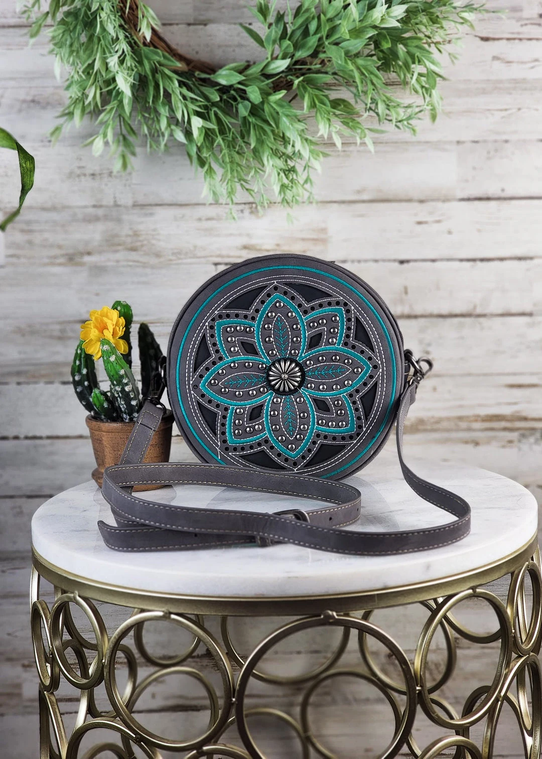 - Elevate your style with the Montana West Black Charcoal Floral Round Crossbody Handbag. Featuring a chic floral design, this handbag is perfect for any occasion.