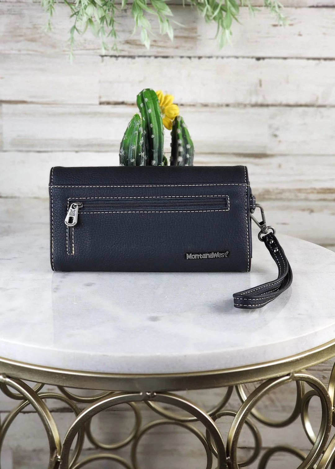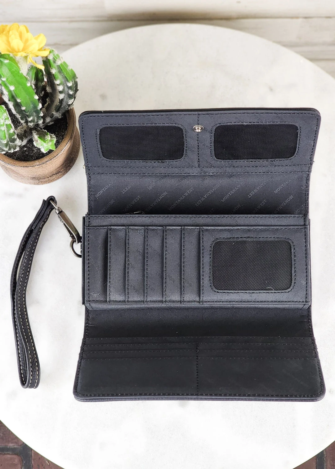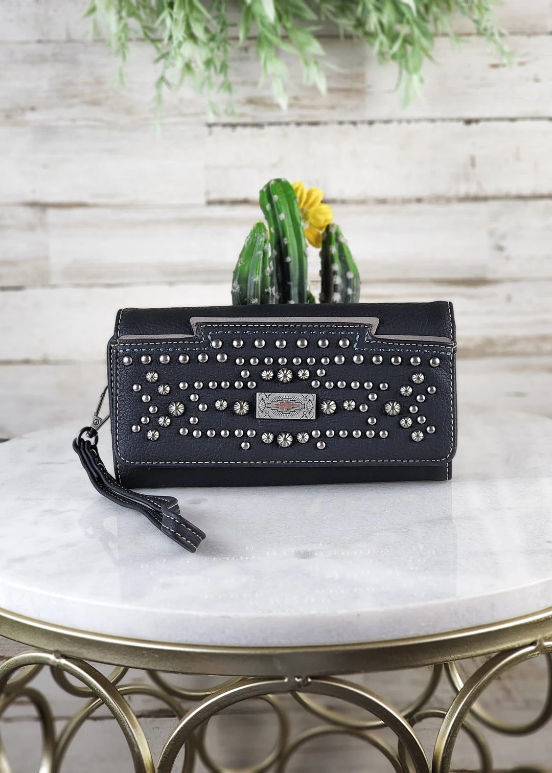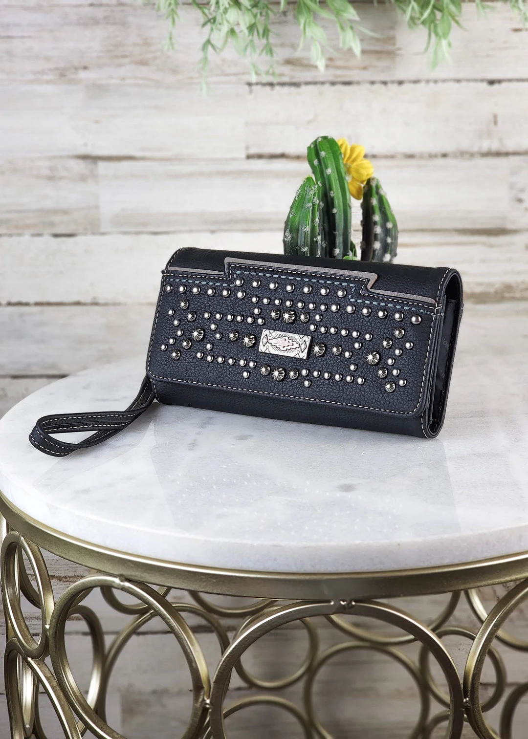 - Elevate your style with the Montana West Black Studded Concho Wristlet Wallet, featuring a chic studded design and a convenient wristlet strap.
