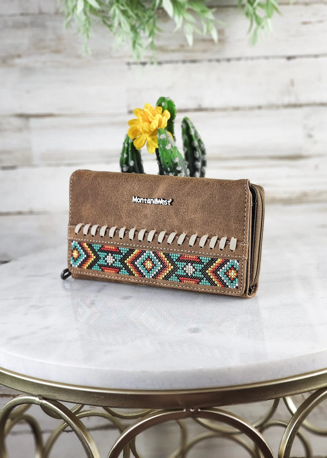 - Elevate your accessory game with the Montana West Brown Aztec Embroidered Wallet. This wallet combines timeless Aztec embroidery with modern functionality, making it a must-have for any fashion-forward woman.