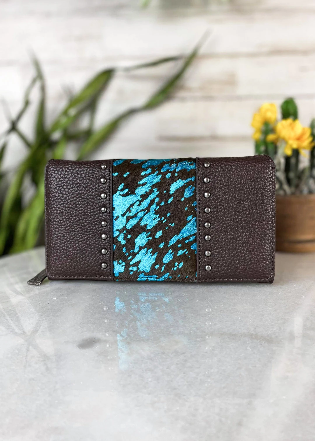- The Montana West Brown & Teal Metallic Cowhide Wallet combines style and durability with its unique cowhide material and metallic finish.