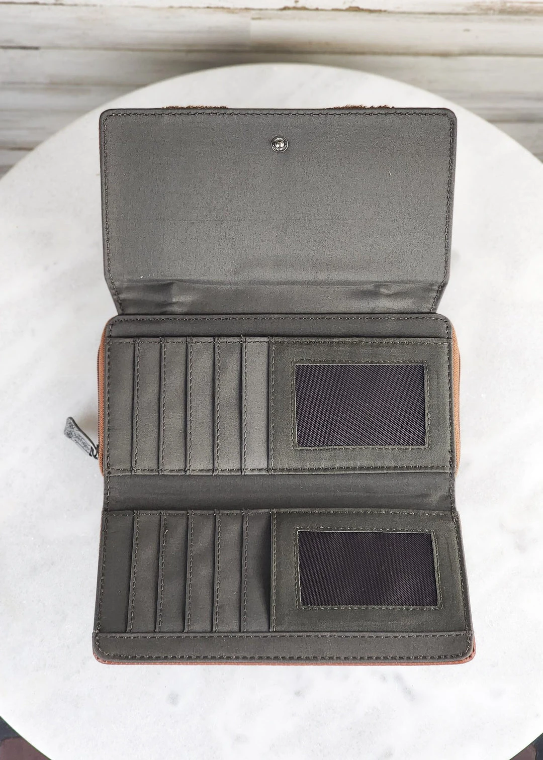 - Features multiple card slots, a bill compartment, and a snap closure to keep your essentials secure and organized.