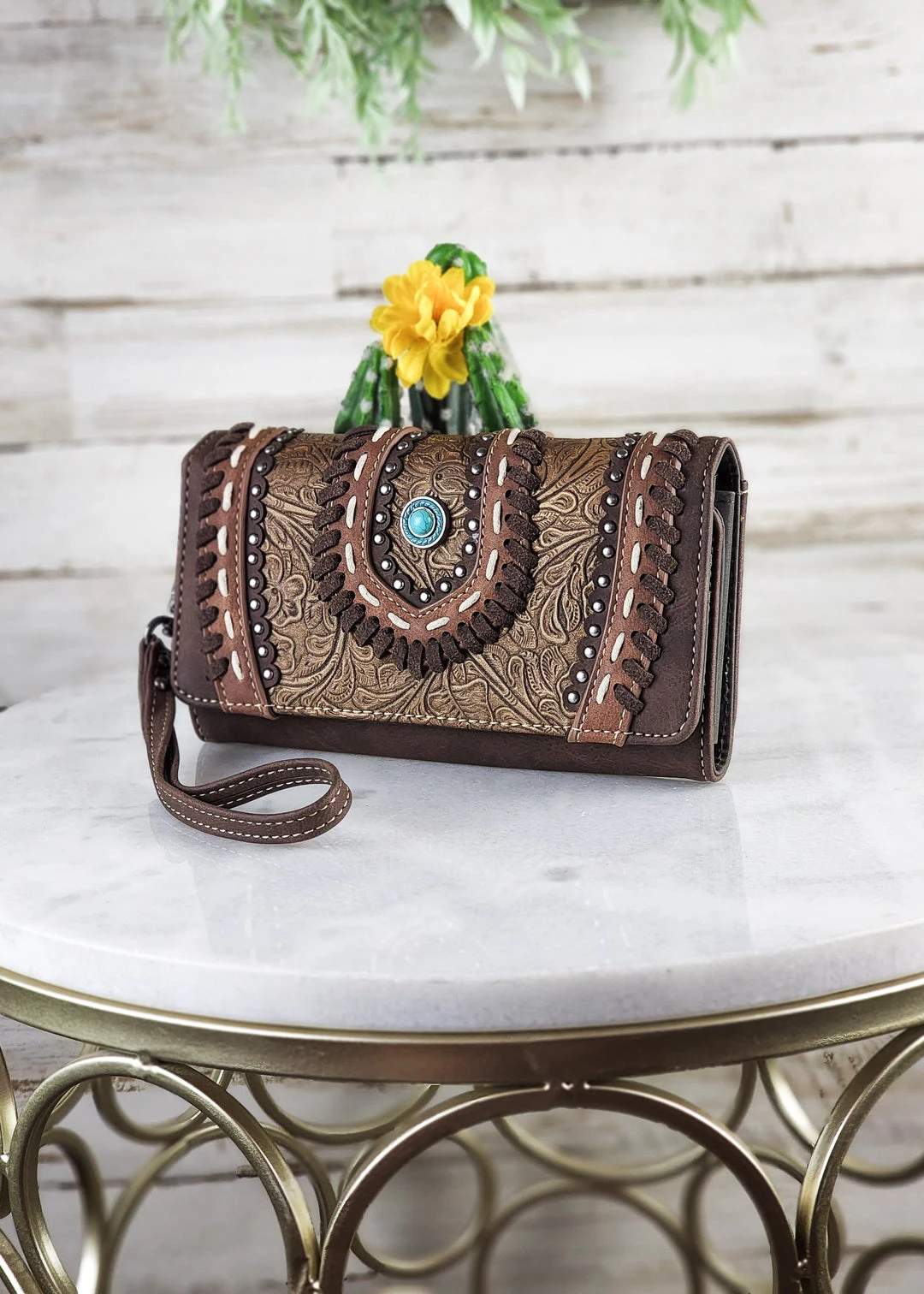 - Elevate your style with the Montana West Coffee Embossed Wristlet Wallet, a sleek and sophisticated addition to your accessory collection.