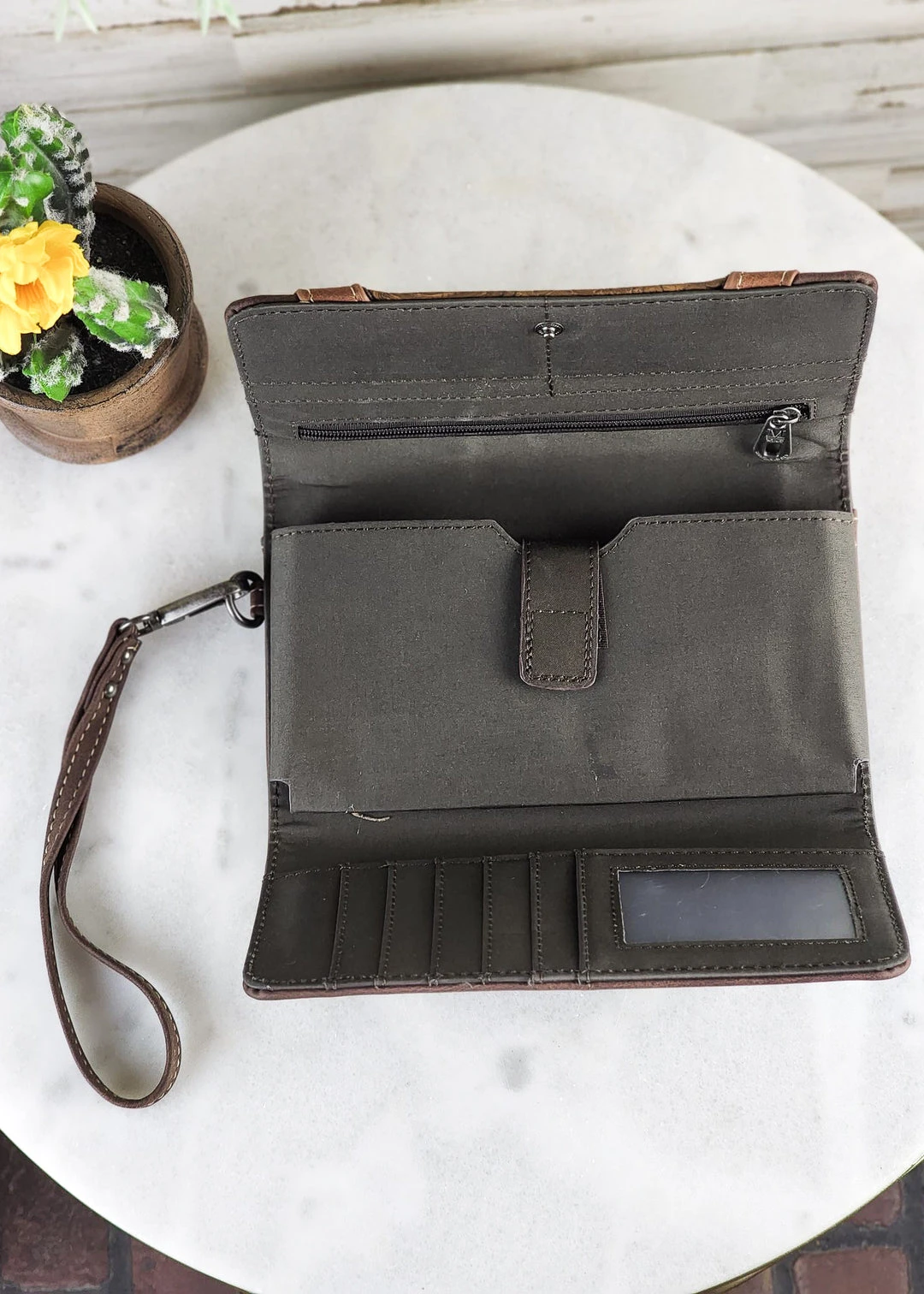 - Crafted with high-quality materials, this wristlet wallet features a luxurious coffee embossed design for a timeless look.