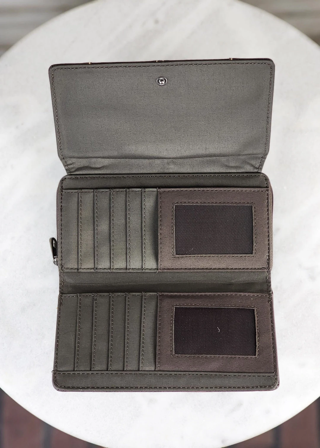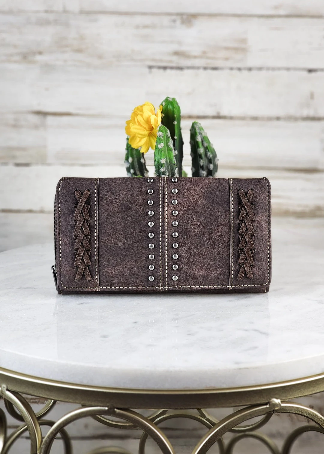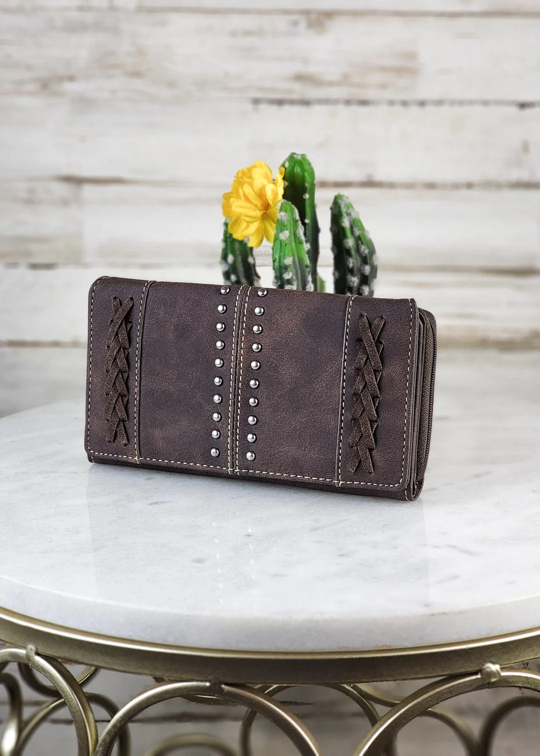 - Elevate your accessory game with the Montana West Coffee Stitched & Studded Wallet. This stylish wallet features a unique coffee-colored design with intricate stitching and studded accents, making it a standout piece for any outfit.