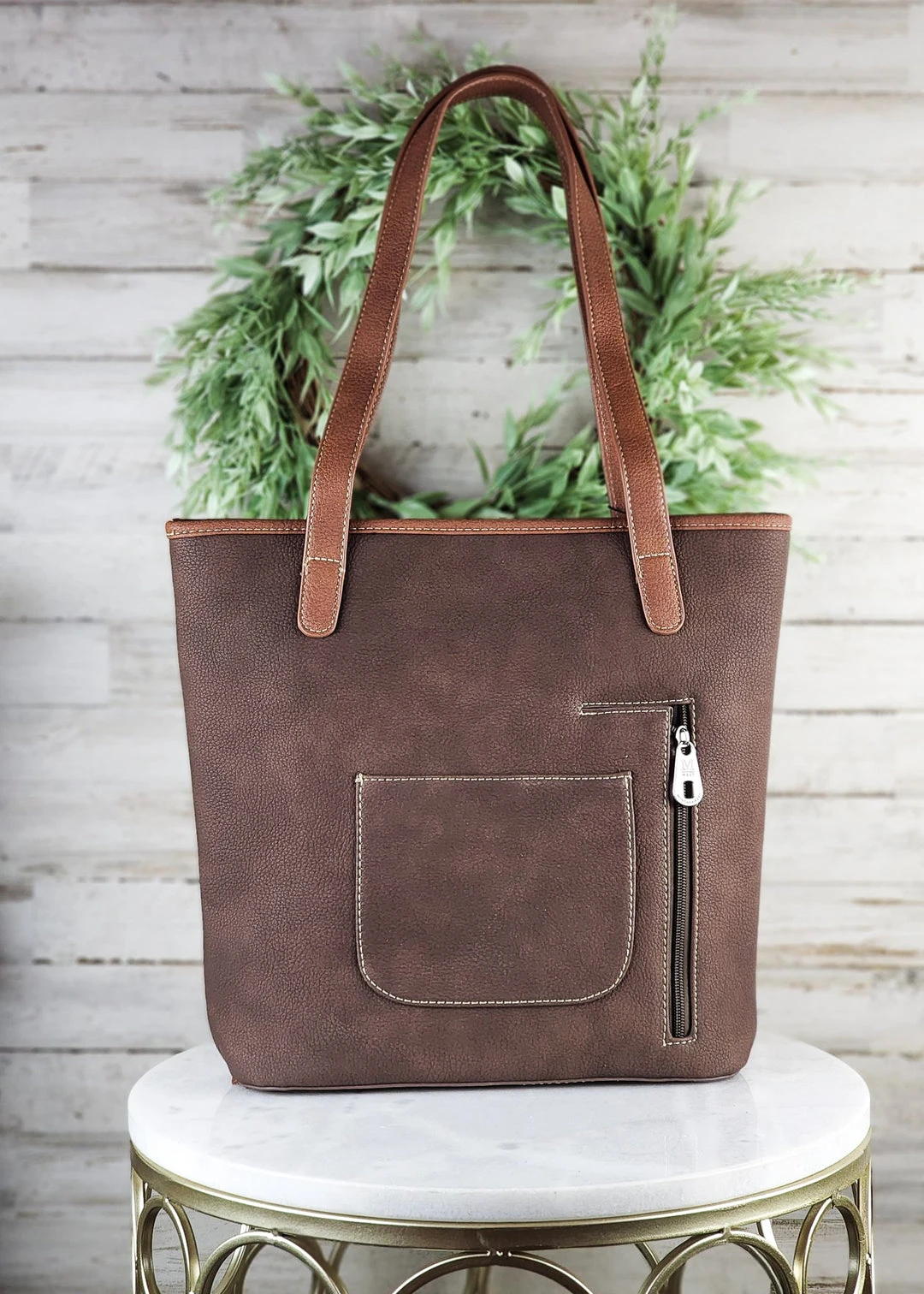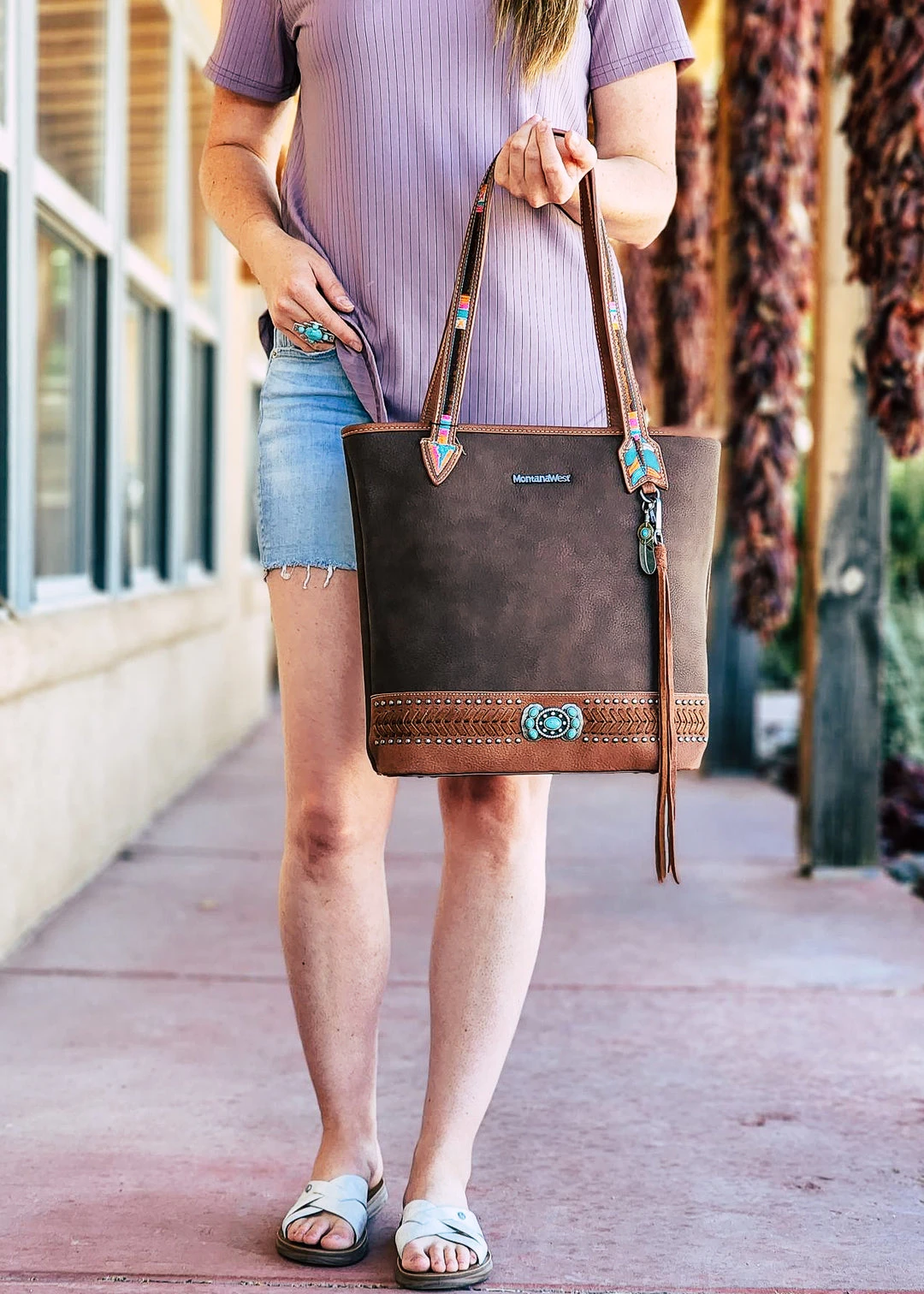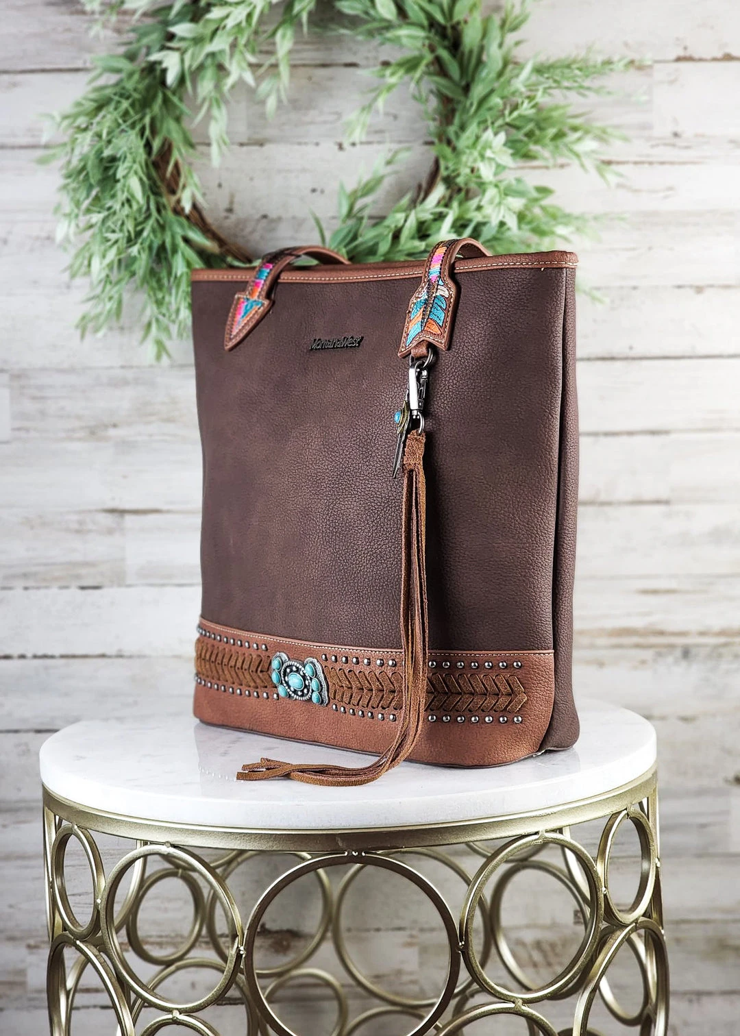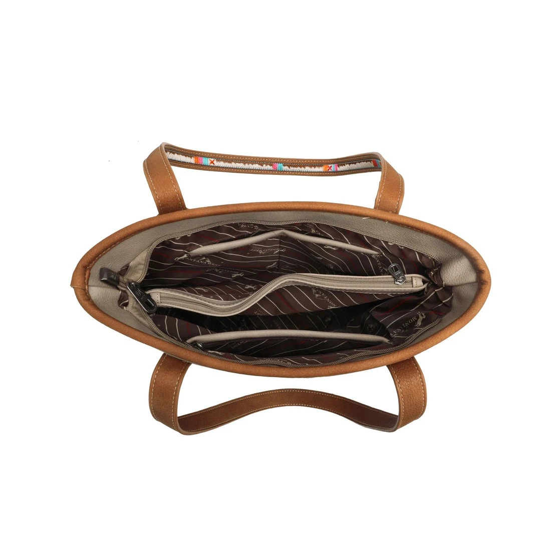 - The Montana West Concealed Carry Brown Arrow Tote Handbag combines elegance with practicality. Its sleek brown design and arrow pattern make it a fashionable accessory for any occasion.