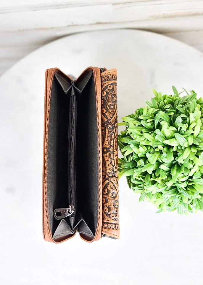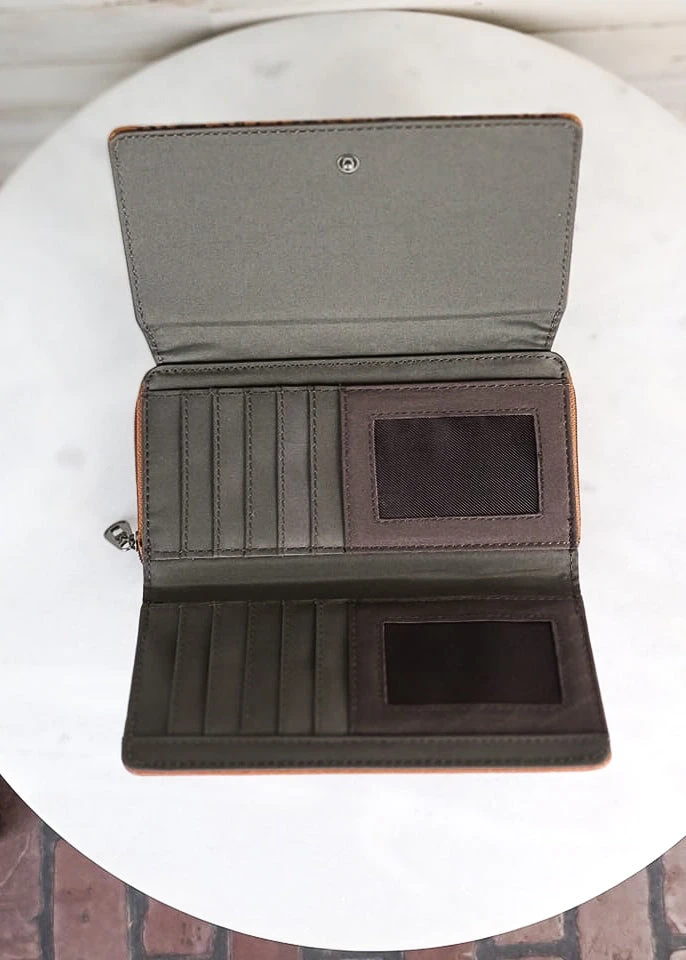 - Zipper closure on the back with single compartment divided by a medium zippered pocket