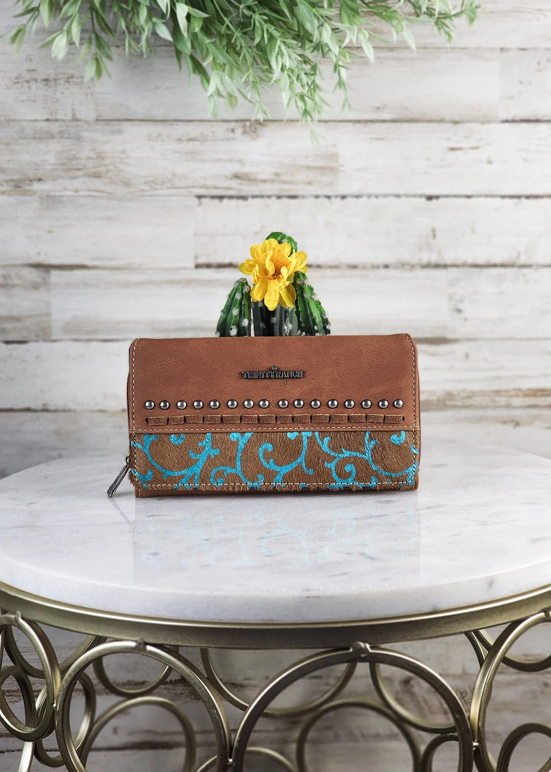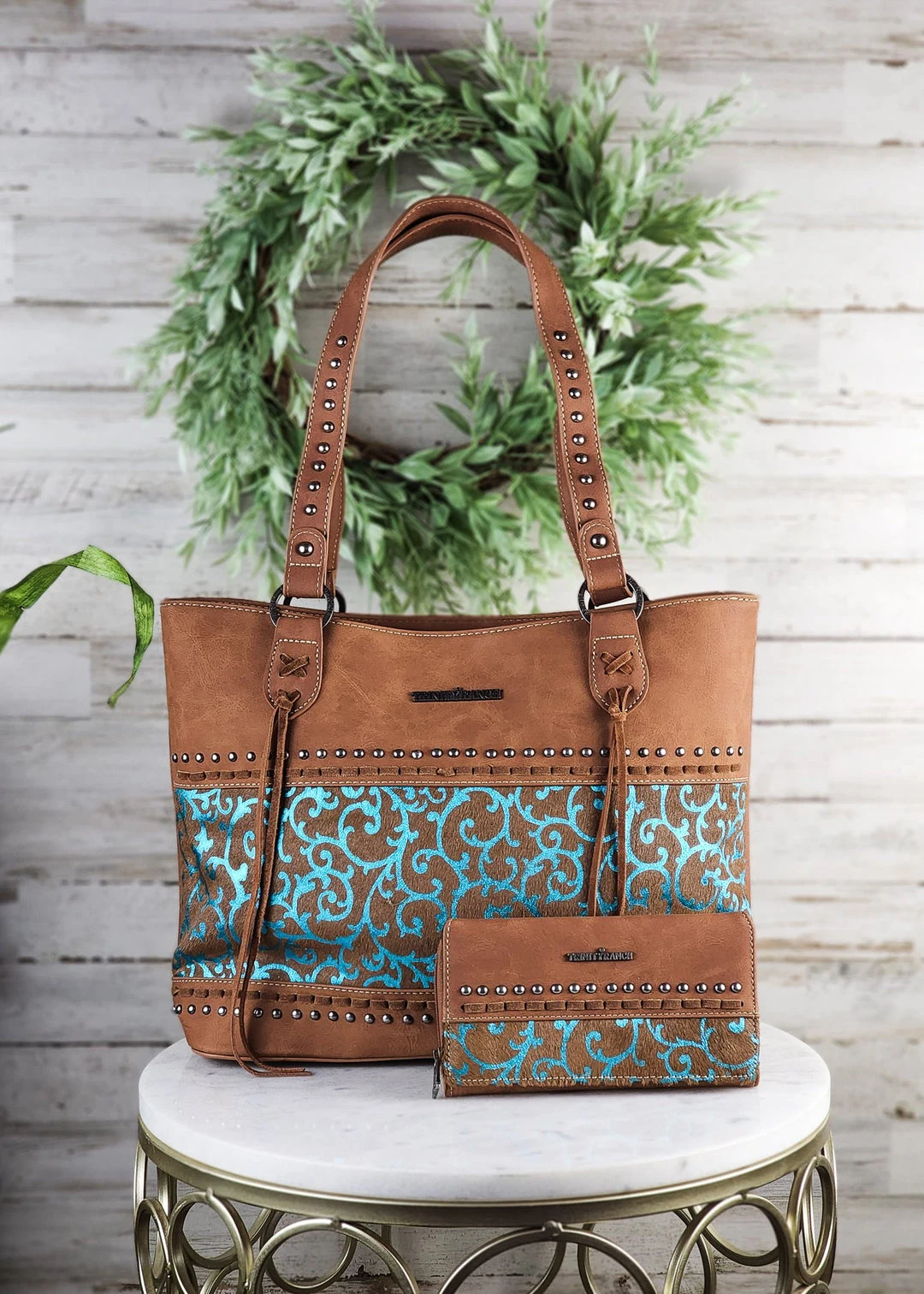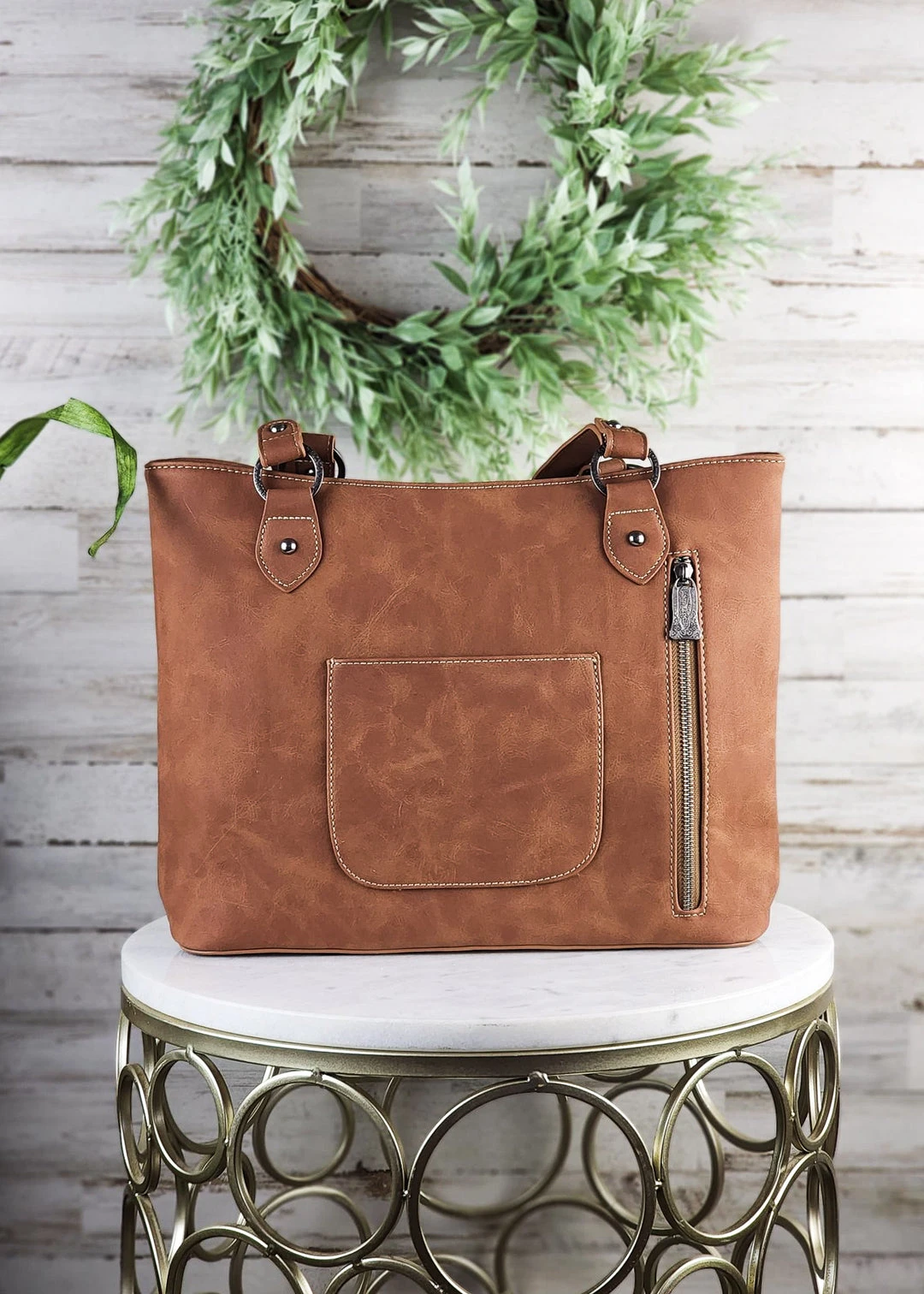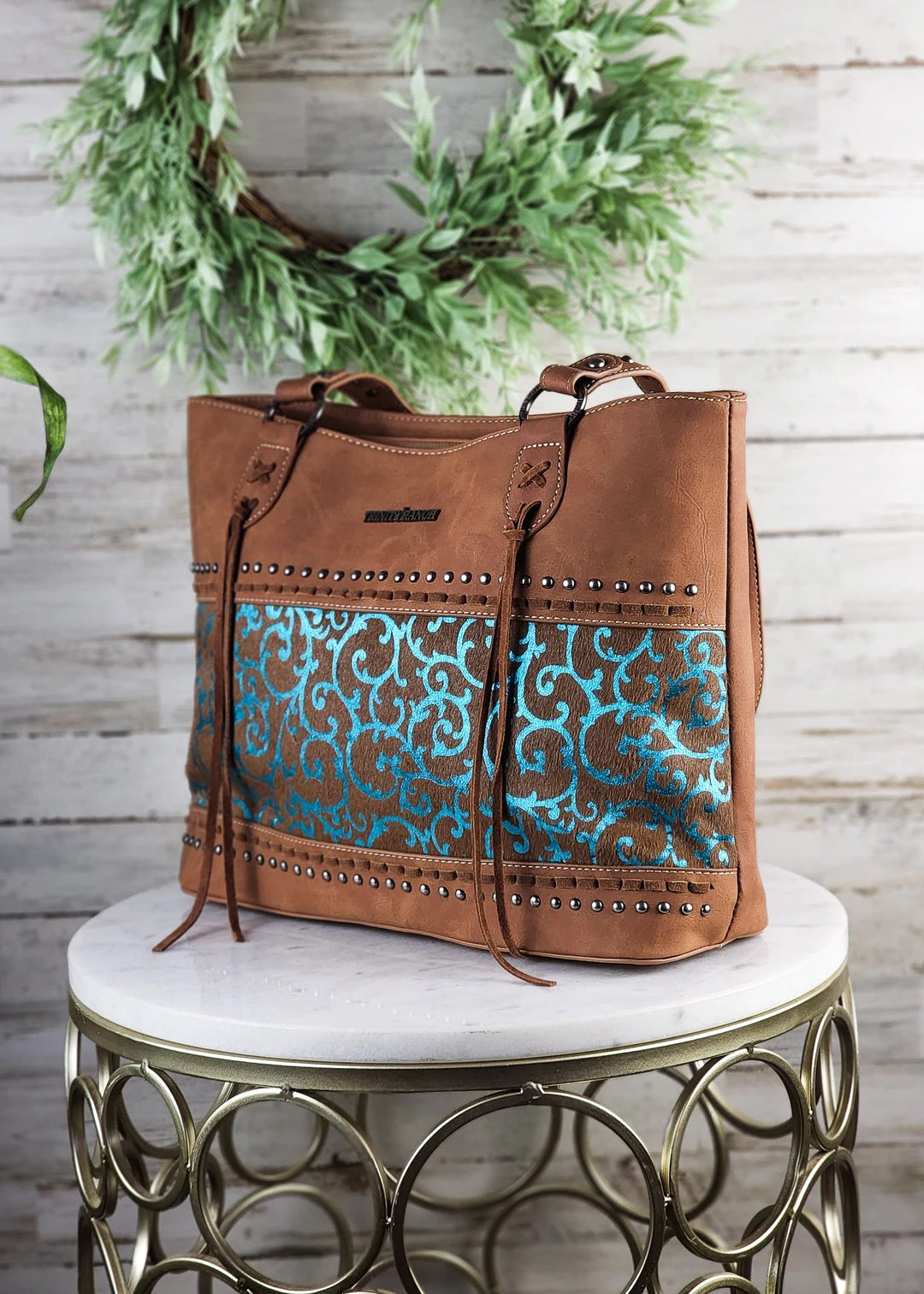 - Accented with antique silver studs and saddle stitch detail