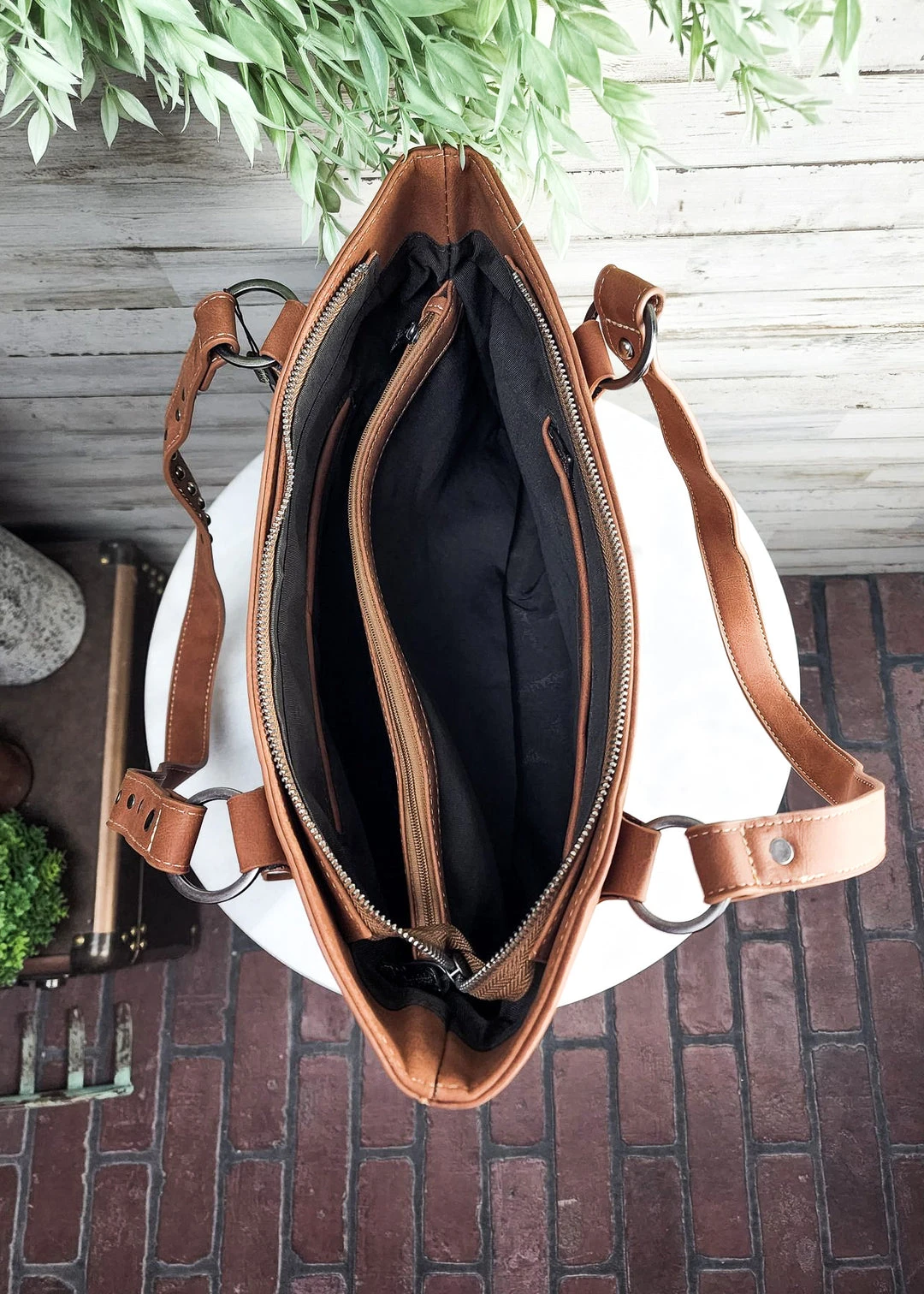 - Inside single compartment divided by a medium zippered pocket
