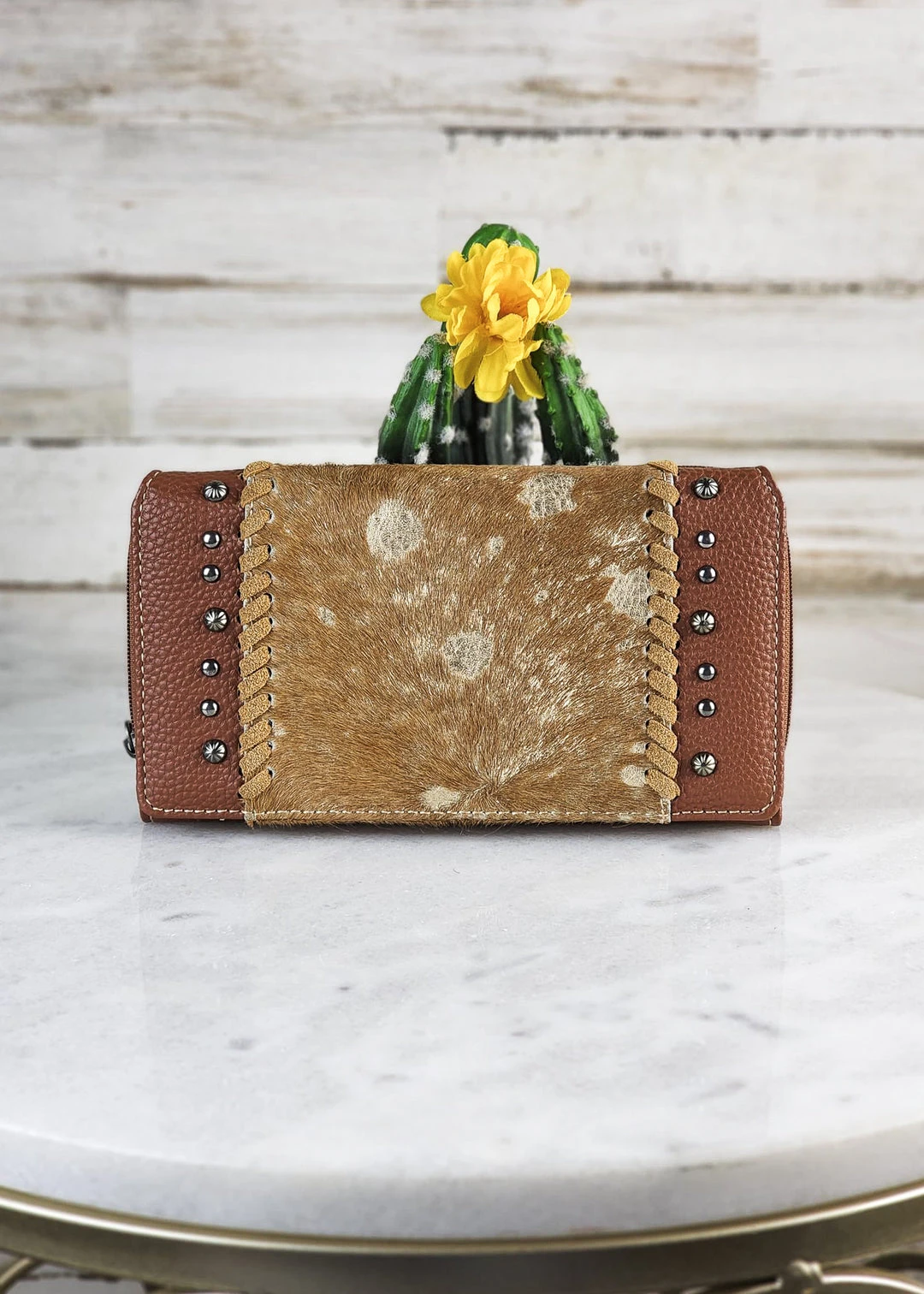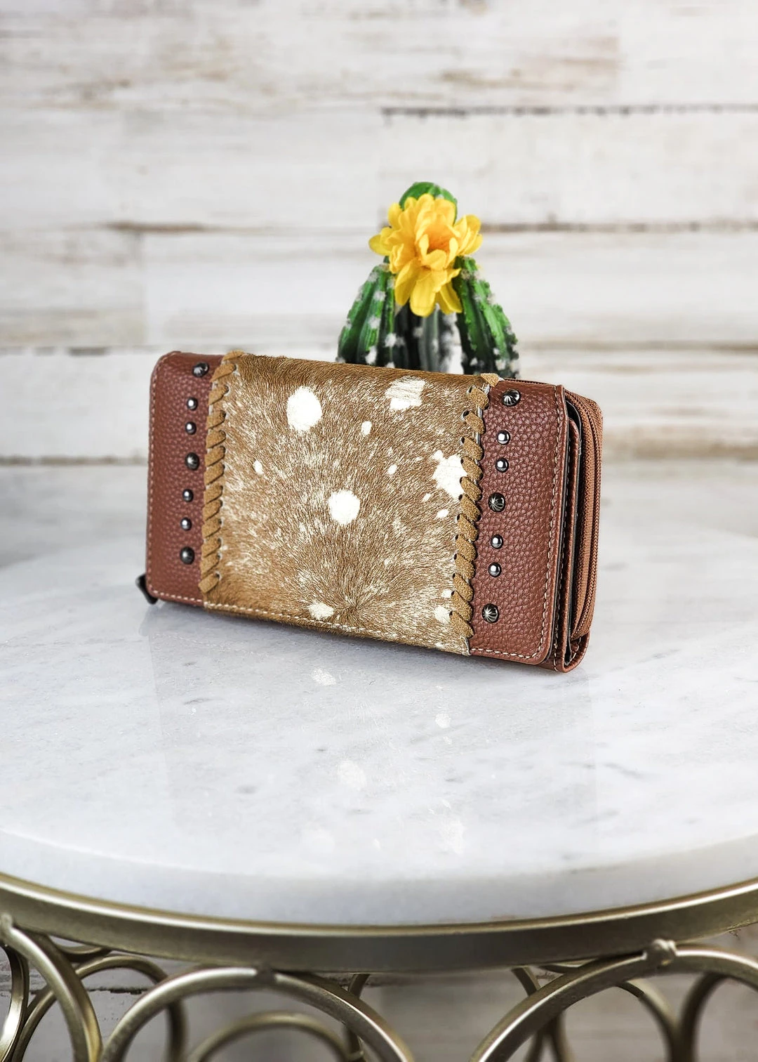 - Elevate your style with the Montana West Gold Metallic Cowhide Wallet, crafted from high-quality cowhide leather for durability and a premium feel.