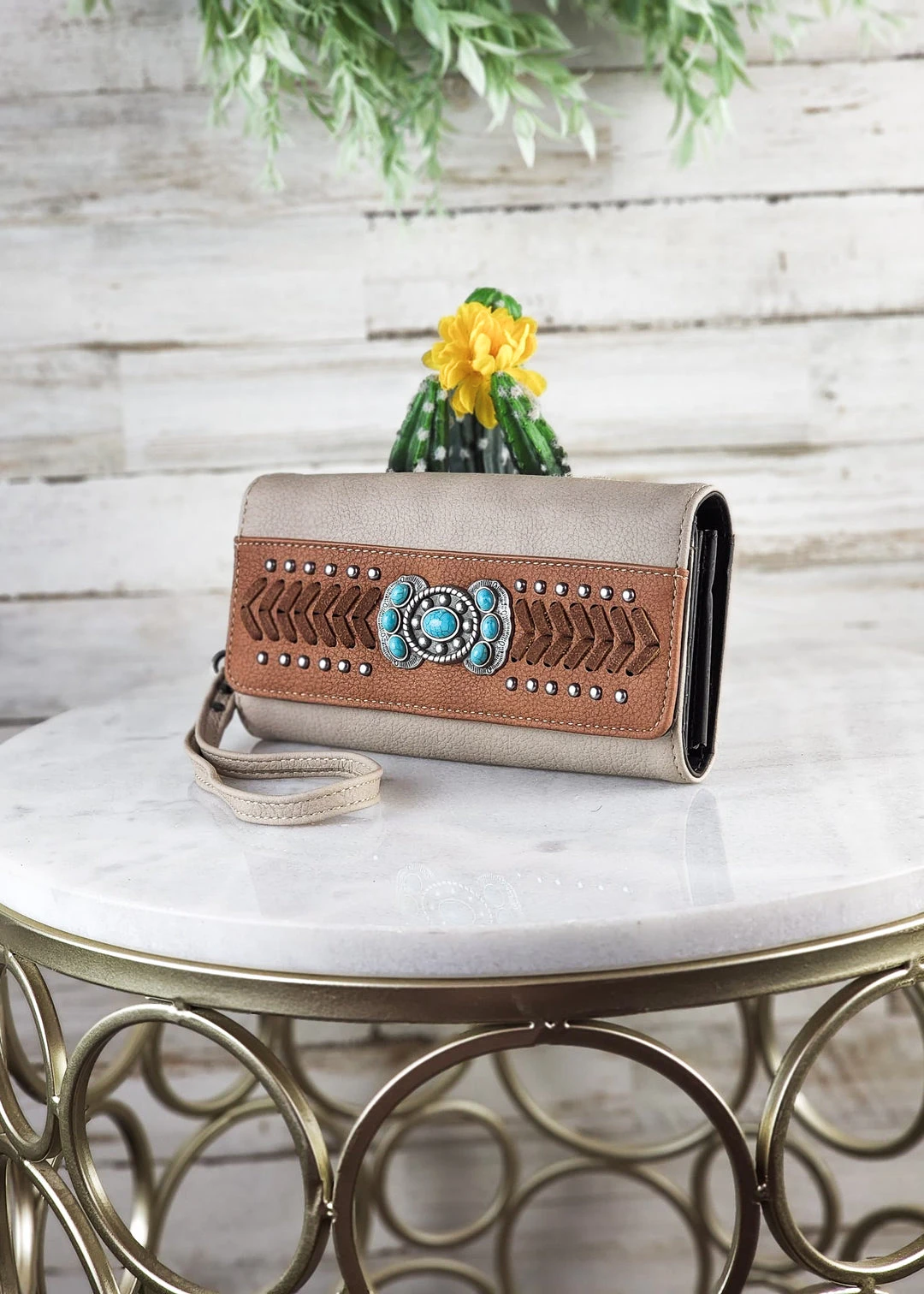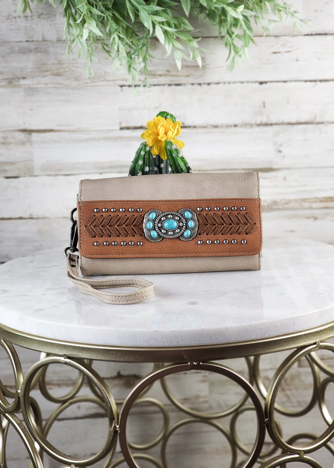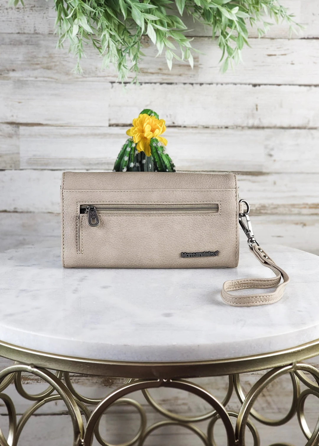 - The Montana West Khaki Concho Wristlet Wallet combines style and functionality, featuring a chic design with a concho detail, making it a perfect accessory for any occasion.