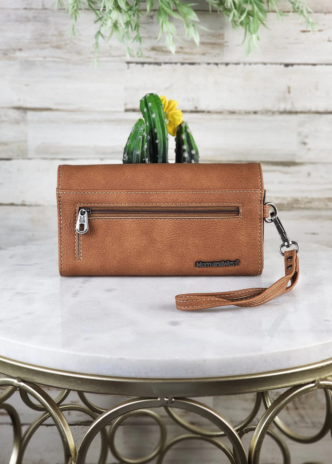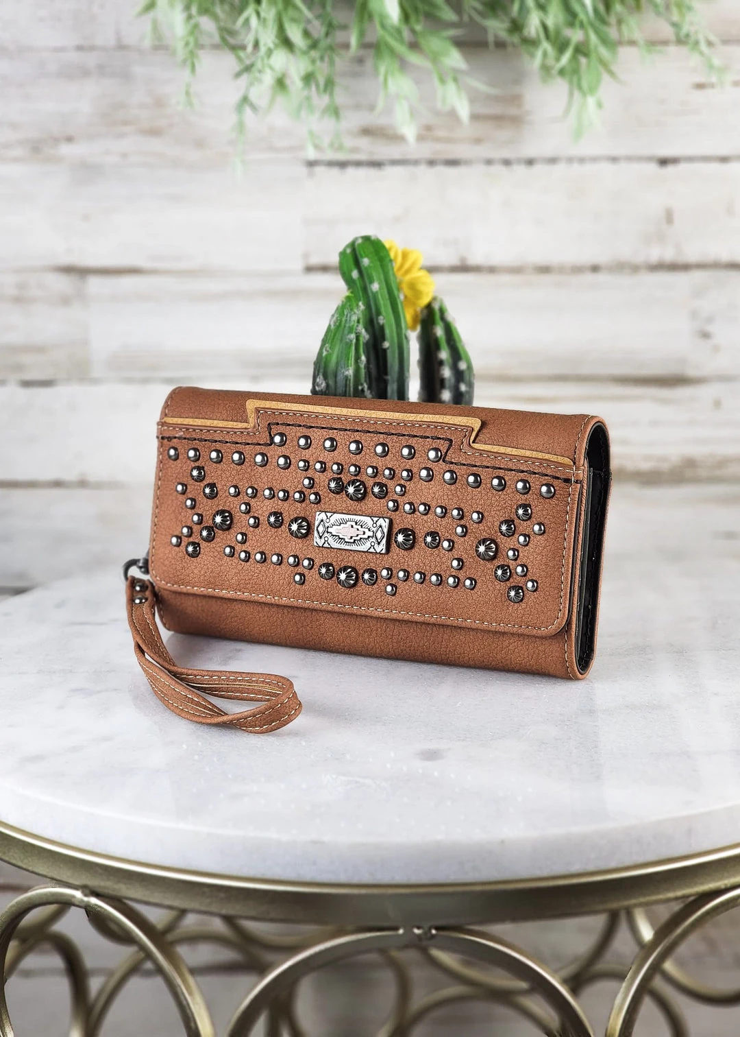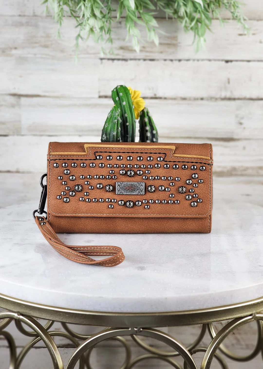 - Elevate your accessory game with the Montana West Brown Studded Concho Wristlet Wallet. This chic wristlet features a bold concho design and studded accents, making it a standout piece in any outfit.