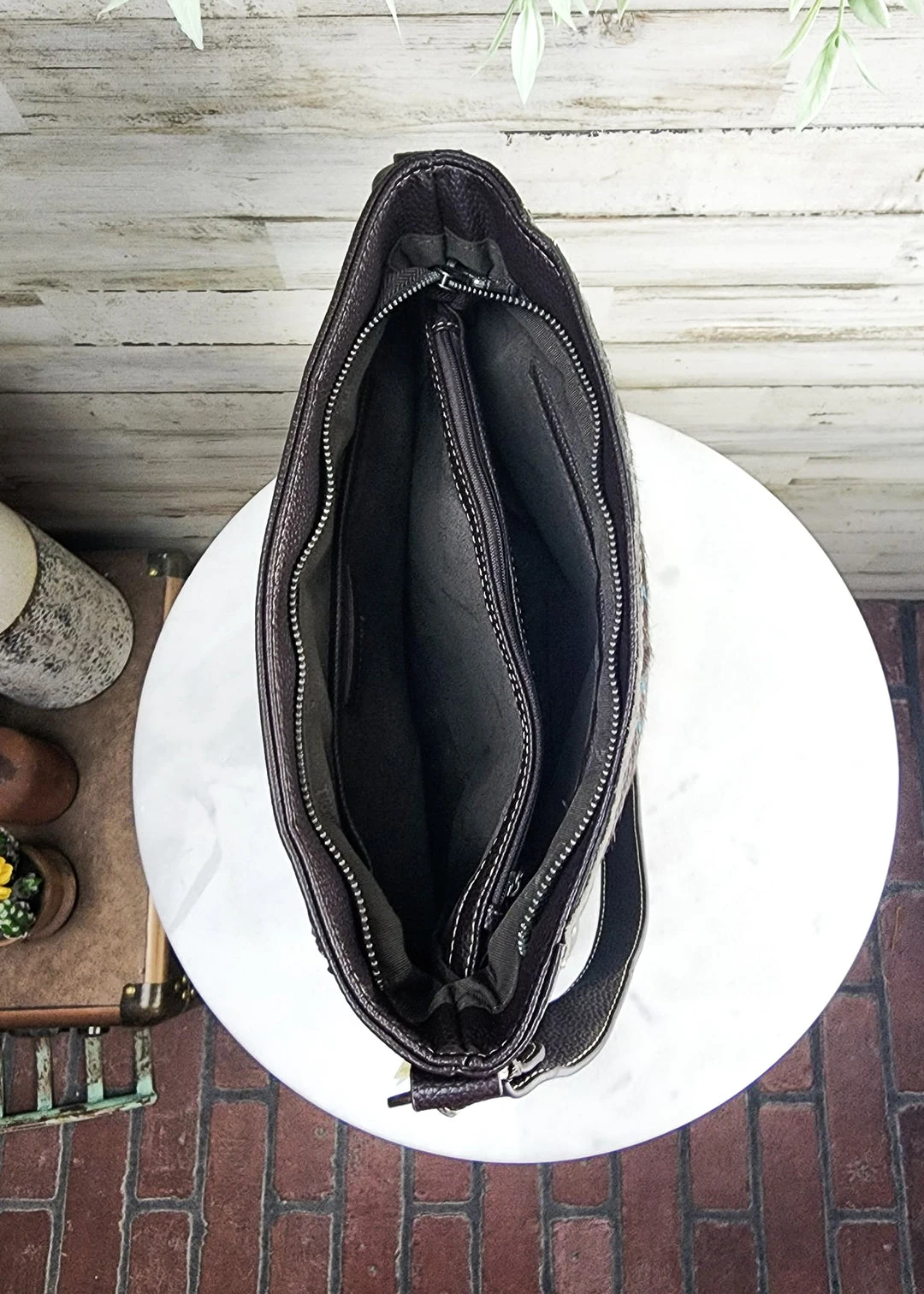 - Zipper closure on the back with single compartment divided by a medium zippered pocket
