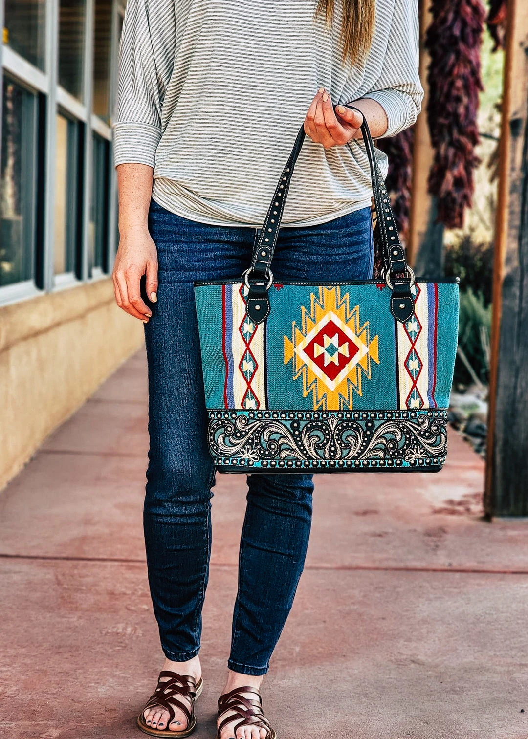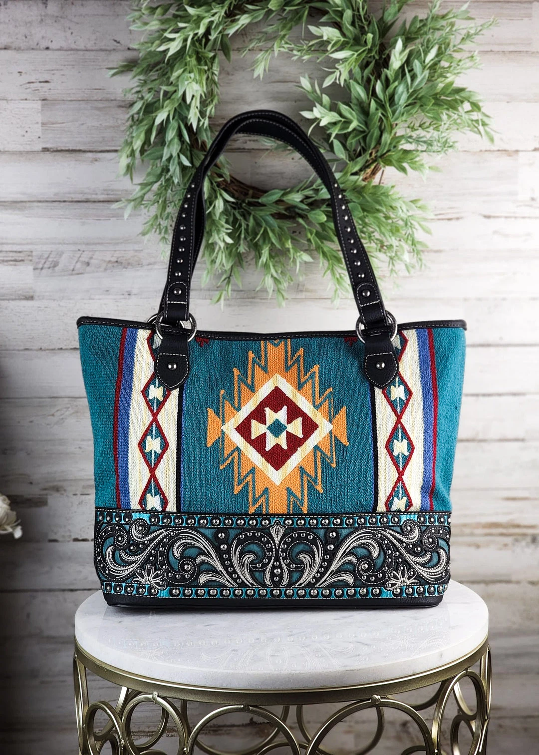 - Stay stylish and secure with the Montana West Turquoise Tooled Tapestry Concealed Carry Tote Handbag. Designed for women who value both fashion and functionality.