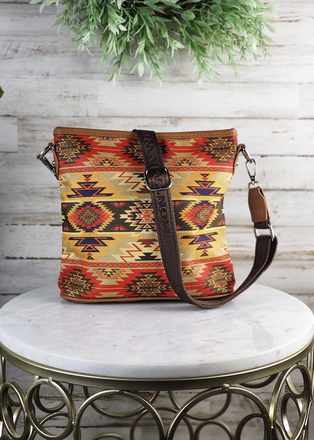 - Elevate your style with the Montana West Warm Multi Color Aztec Canvas Crossbody Handbag. This handbag features a vibrant Aztec print, making it a perfect accessory for any outfit.