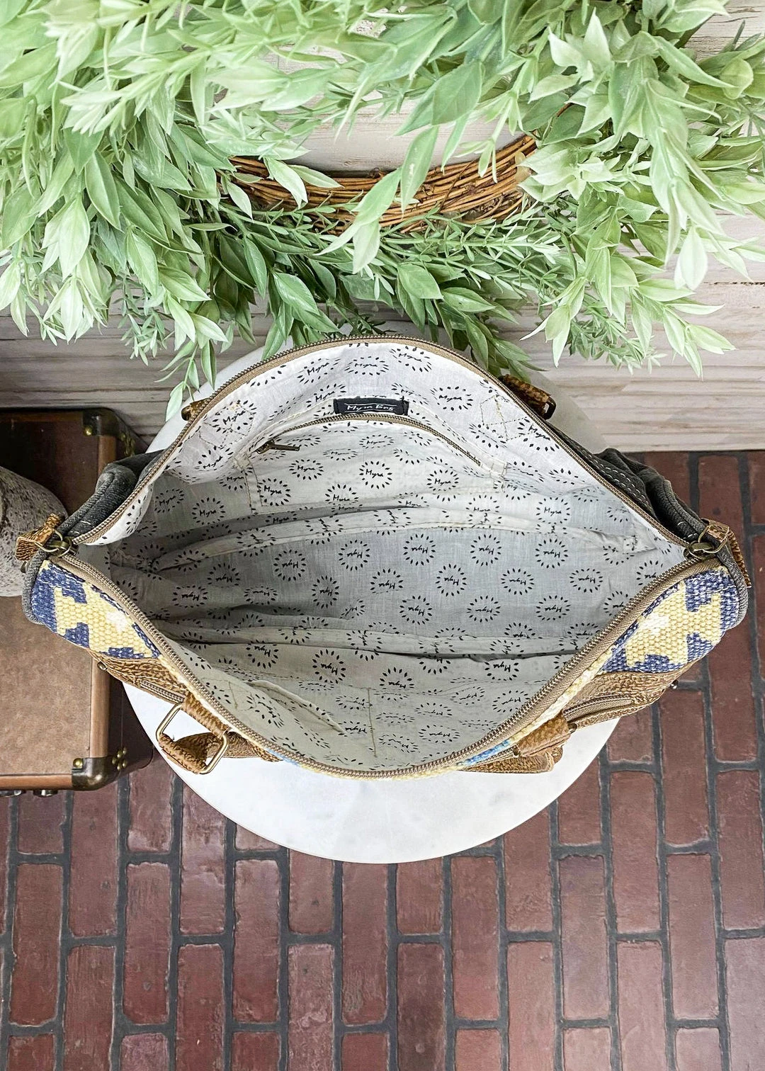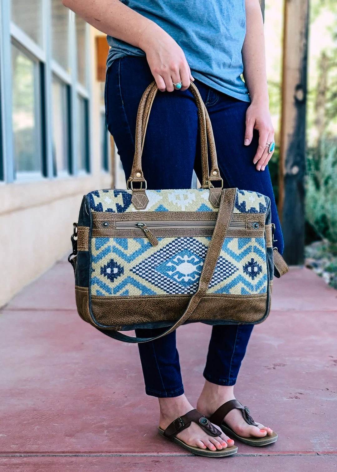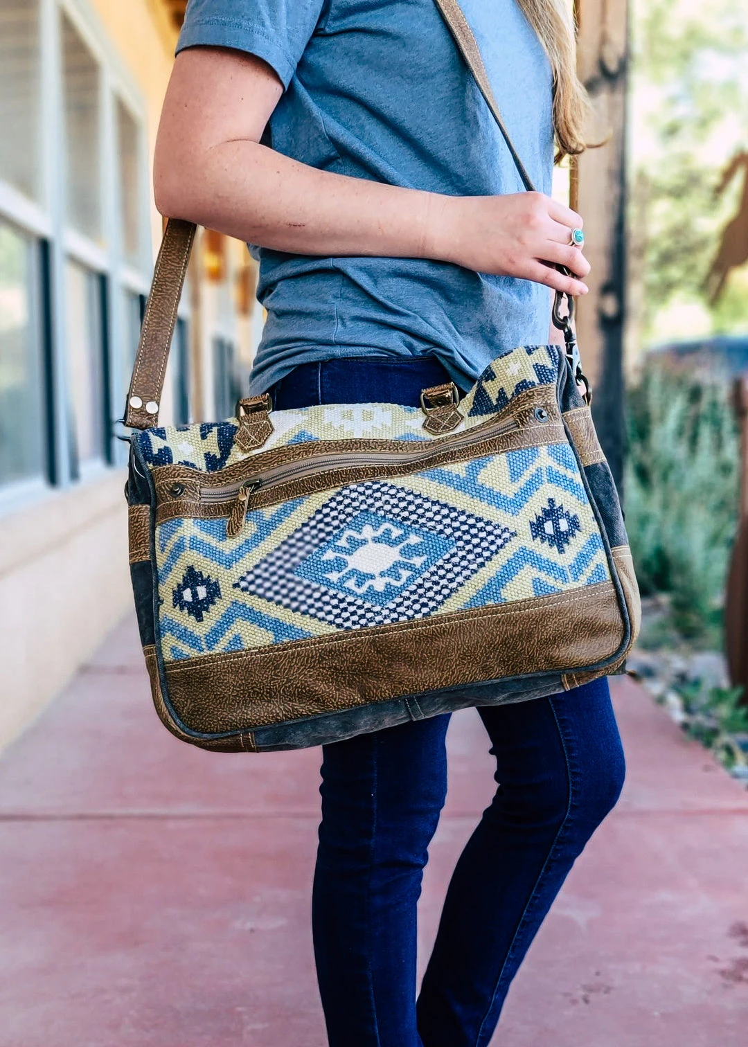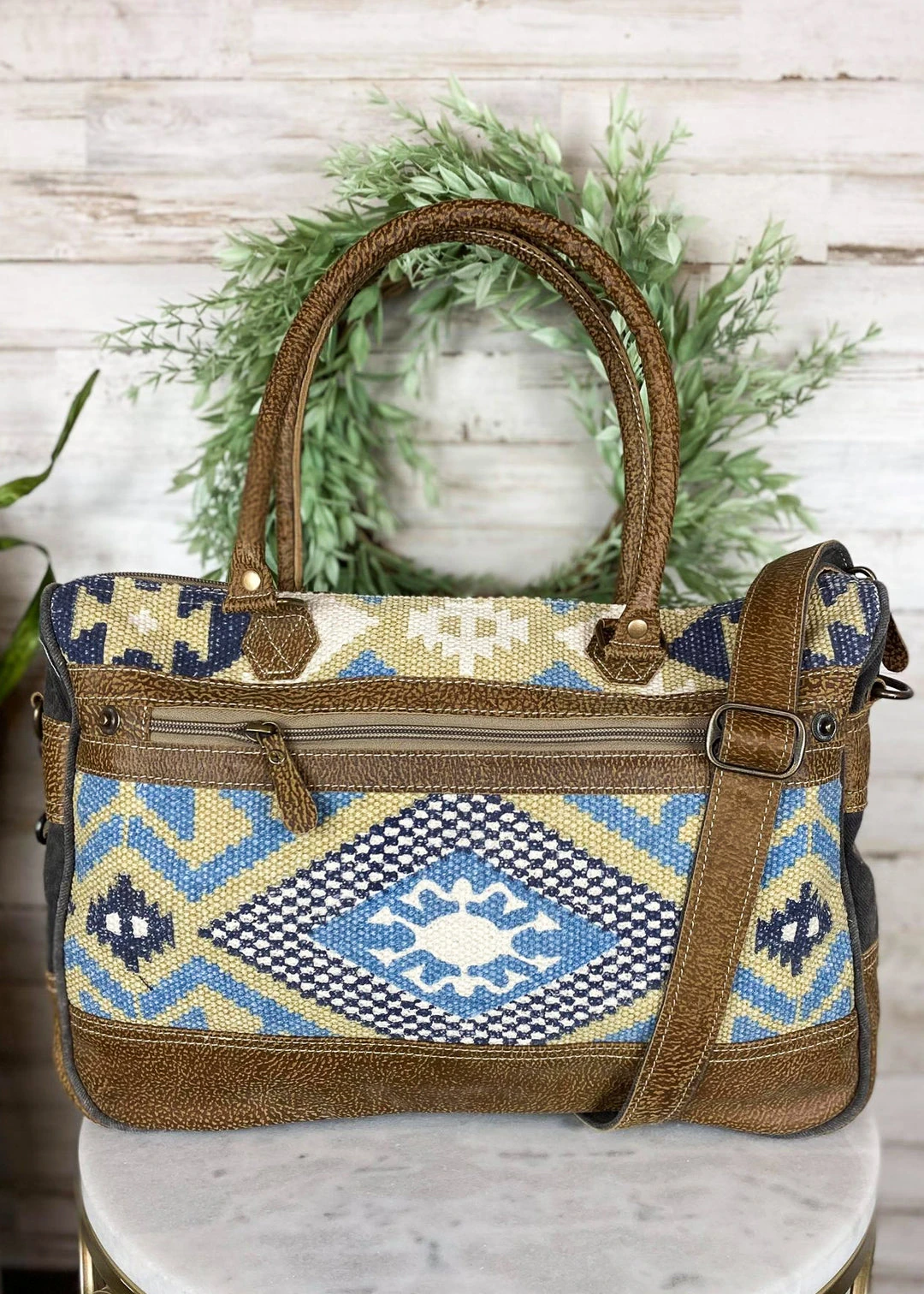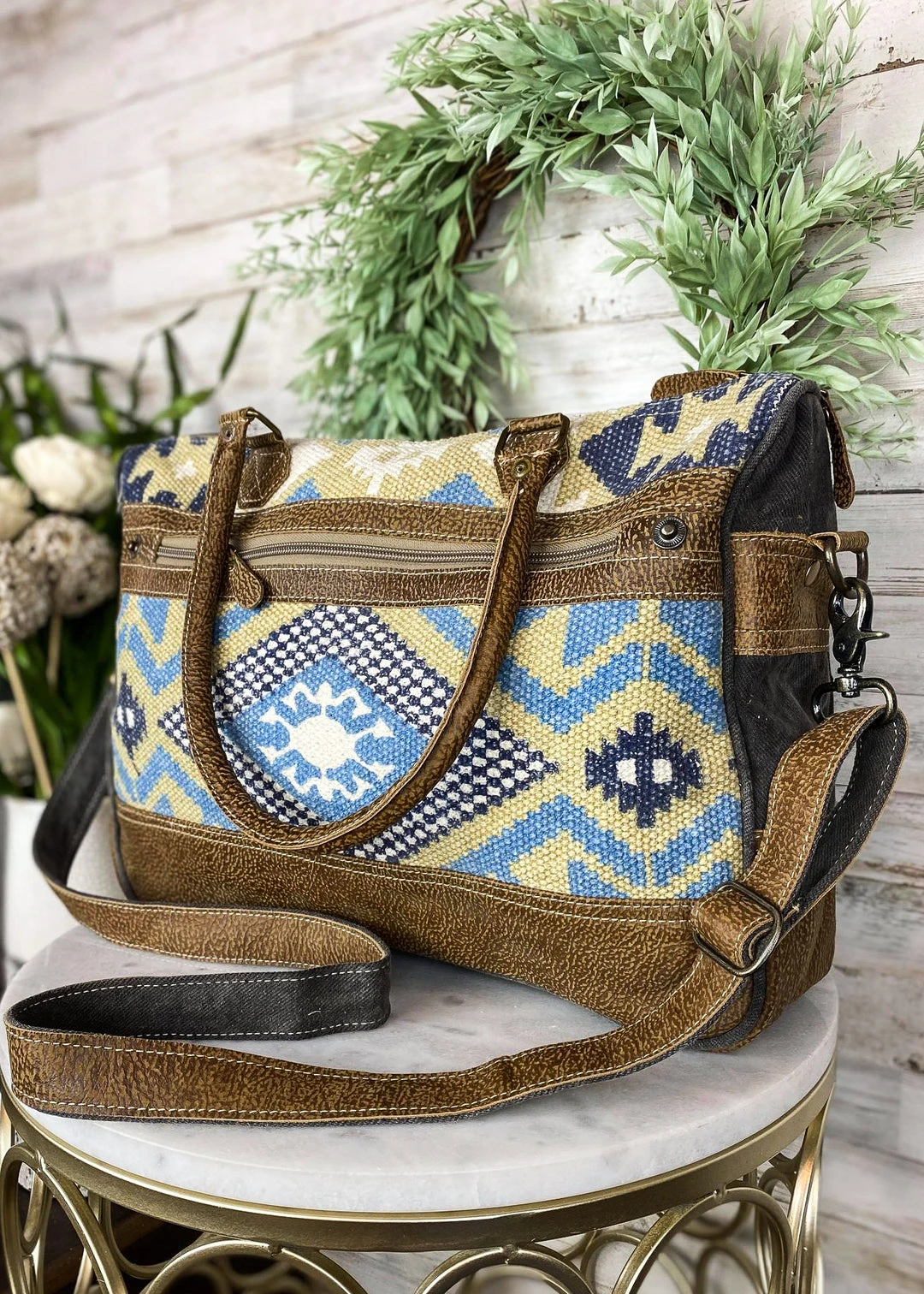 - Elevate your style with the Myra Aqua Aztec Messenger Handbag. This trendy handbag features a vibrant Aztec print, combining fashion and functionality for the modern woman.