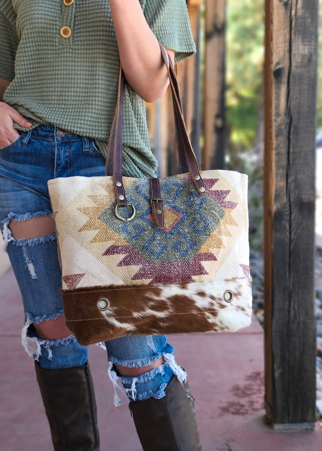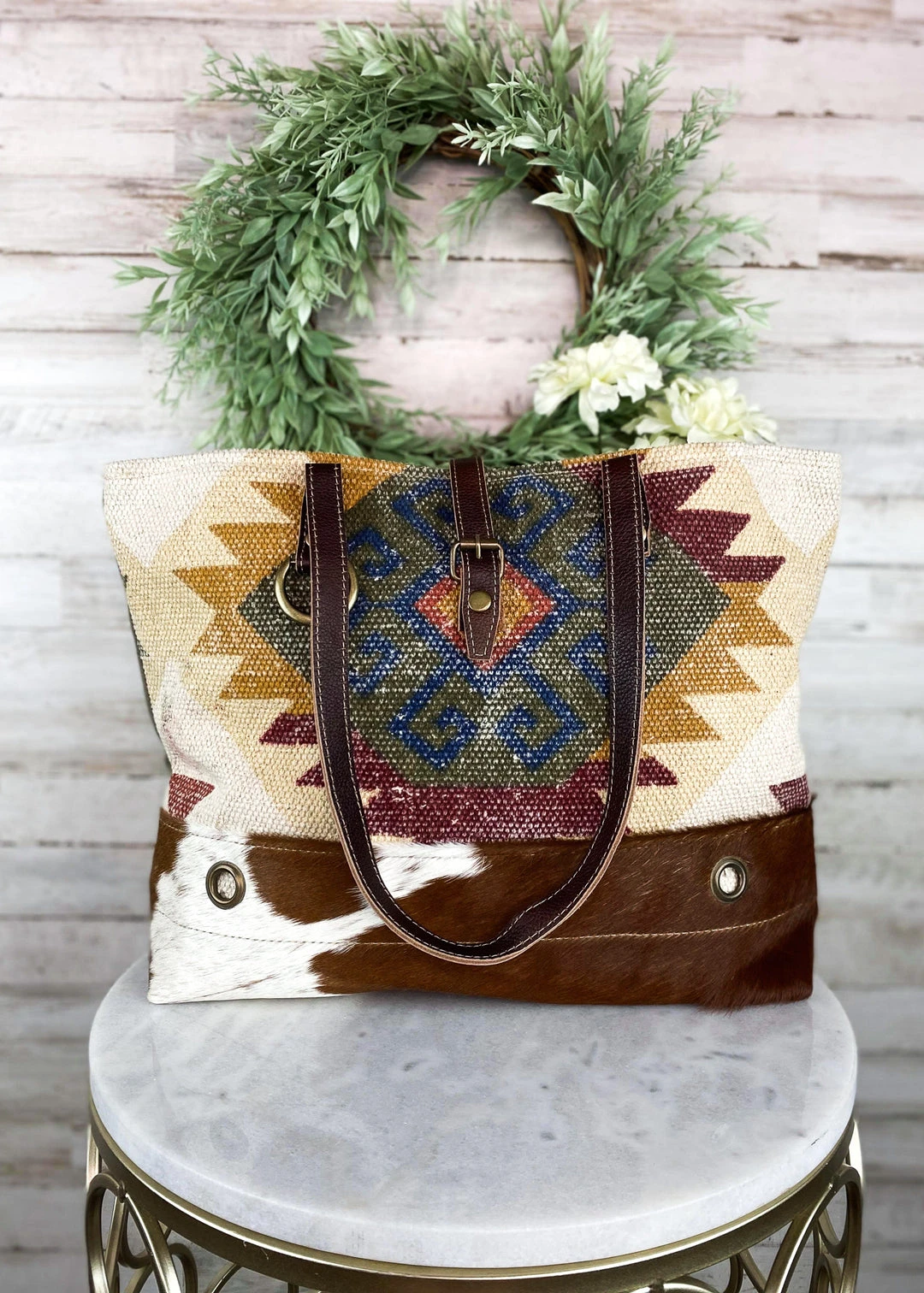 - Experience premium quality with the Myra Aztec Cowhide Tote Handbag. Its stylish design and practical features make it a must-have accessory for any fashion-forward individual.