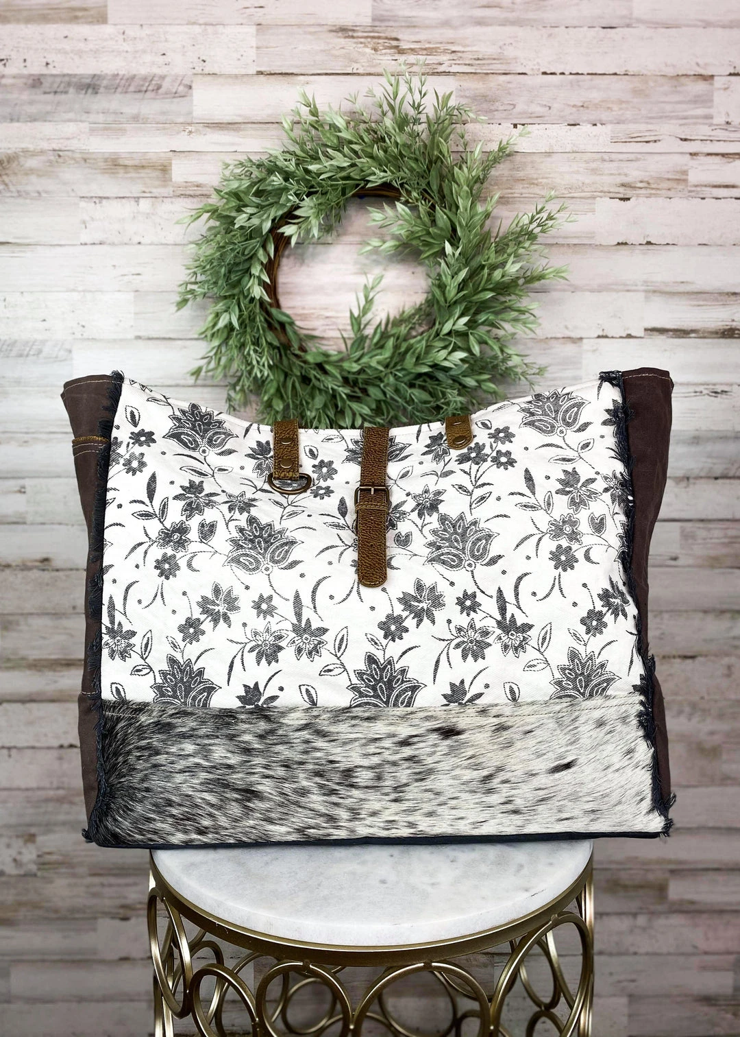 - Elevate your style with the Myra Weekender Bag, crafted from premium black cowhide leather adorned with a stunning ivory floral pattern. Perfect for travel, work, or casual outings.