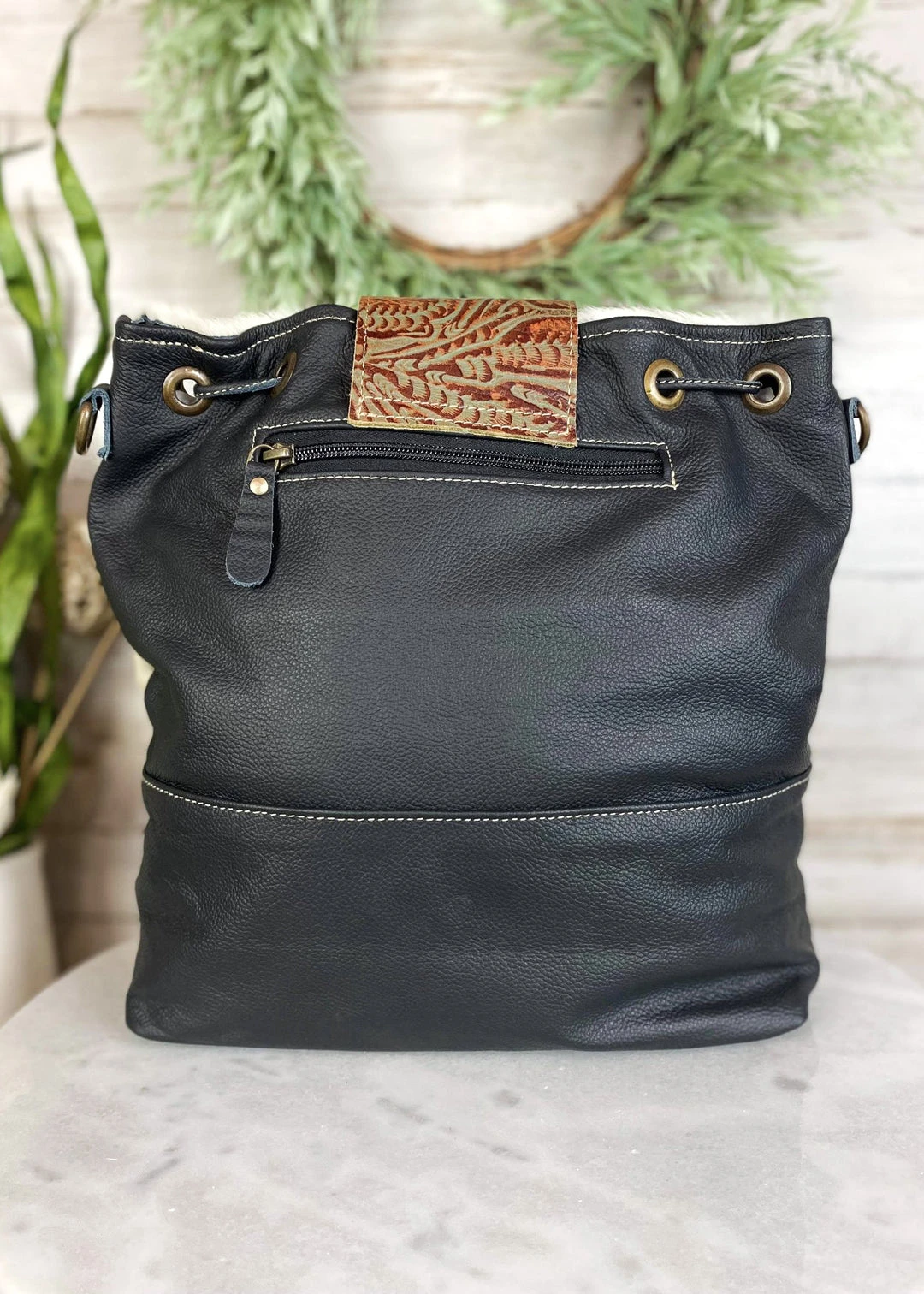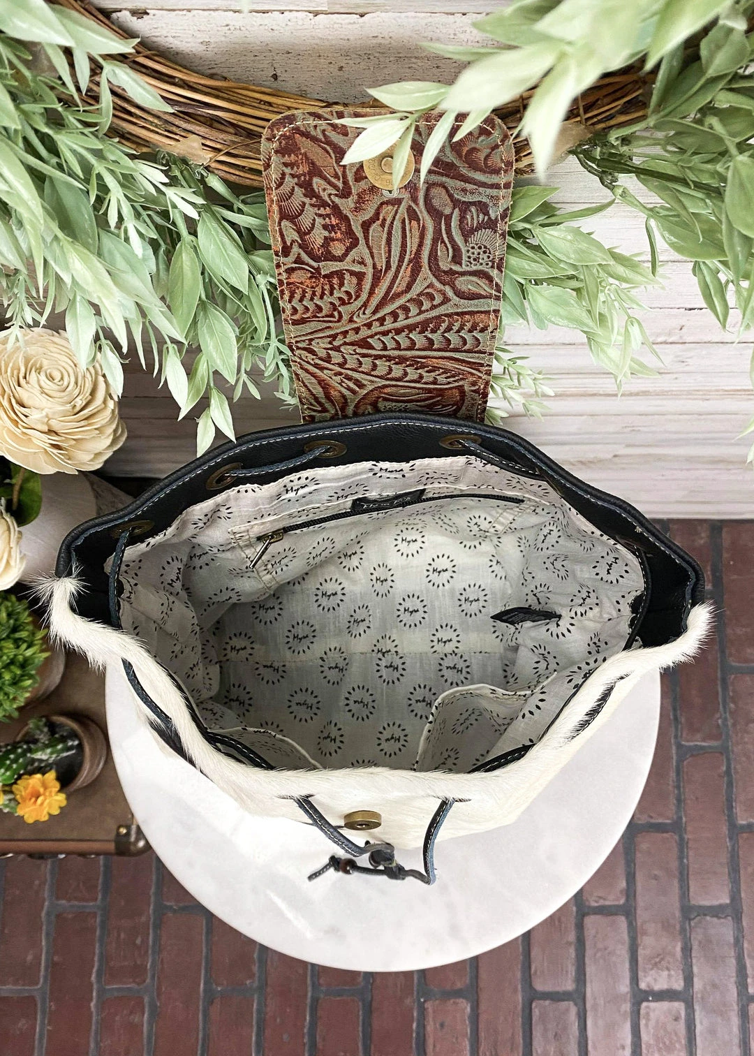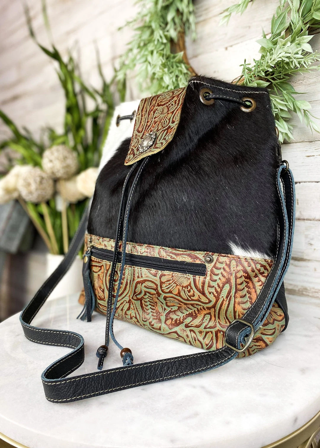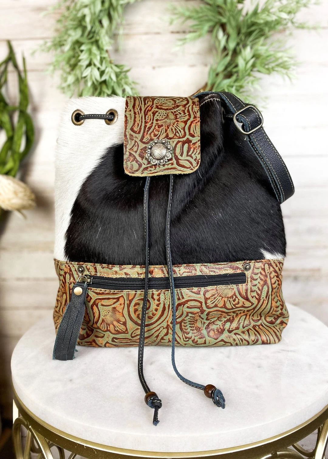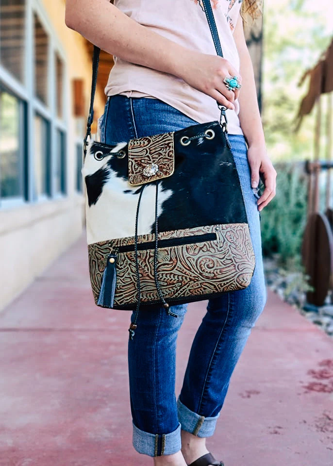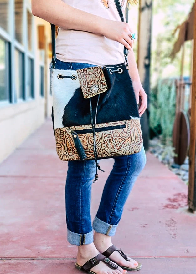 - Elevate your style with the Myra Black & White Cowhide Drawstring Crossbody Handbag. Crafted from high-quality cowhide leather, this handbag offers a unique and chic look.
