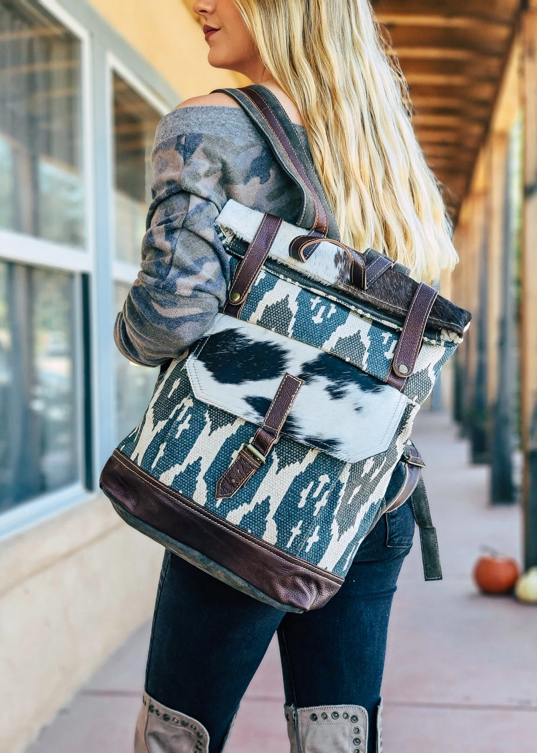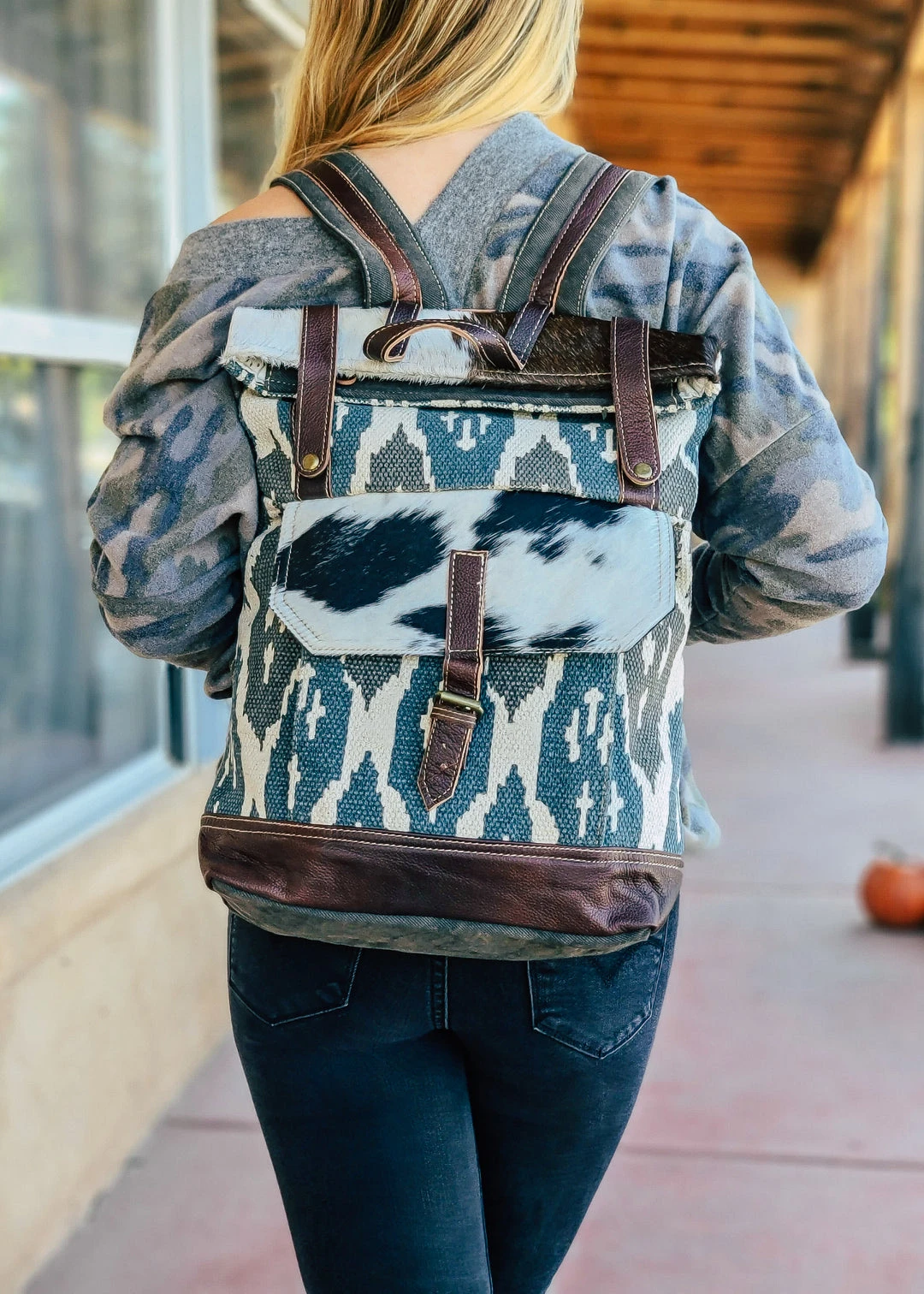 - This backpack features a vibrant Aztec pattern in blue and gray tones, making it a standout accessory that complements any outfit.