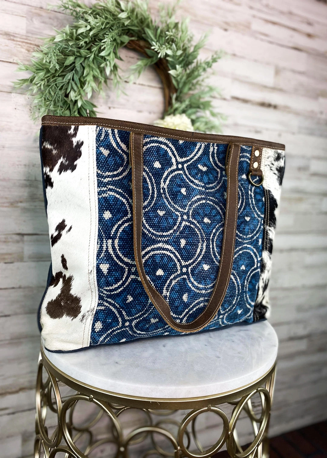 - Elevate your style with the Myra Blue Pattern Cowhide Tote Handbag. Crafted from high-quality cowhide leather, this tote bag combines durability with a chic blue pattern design.