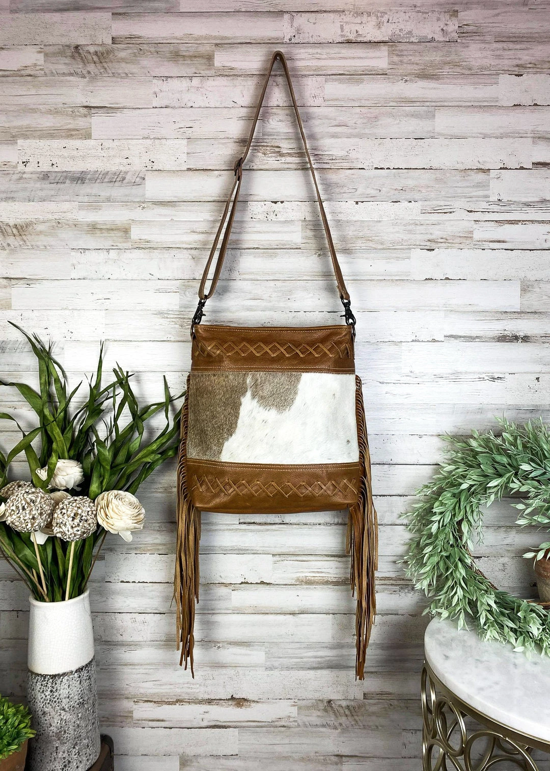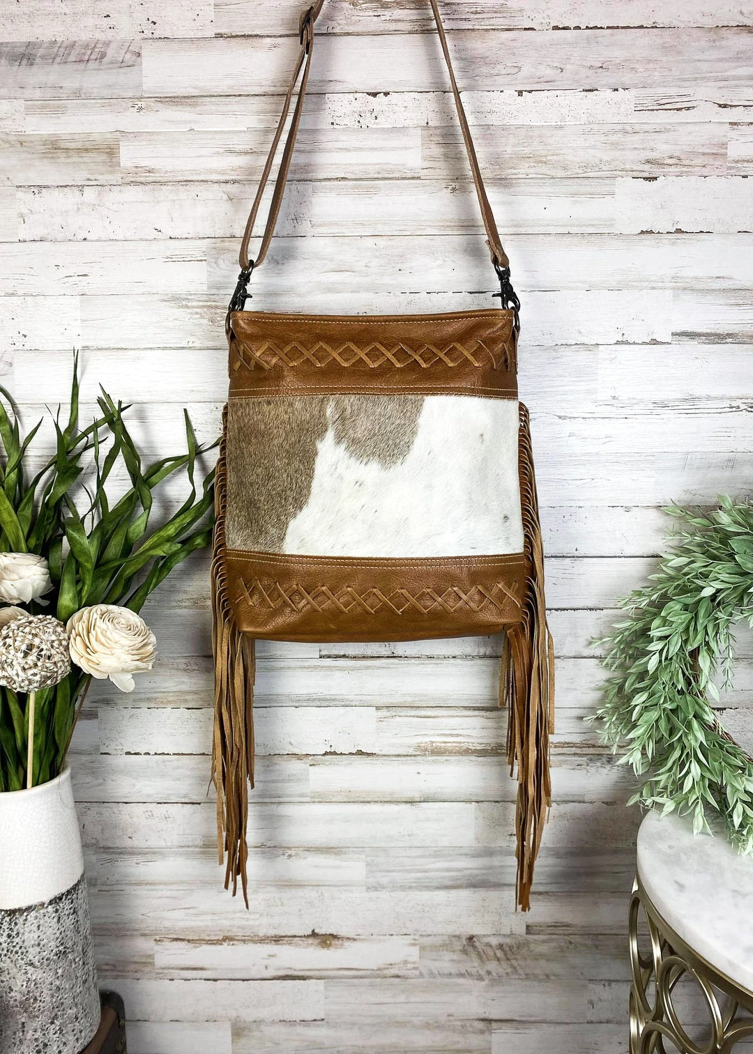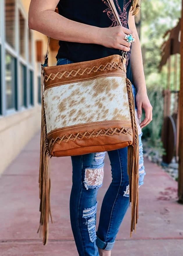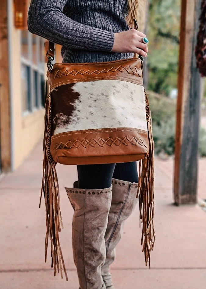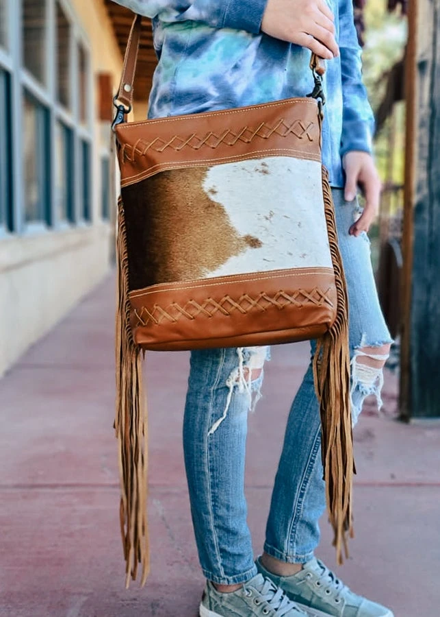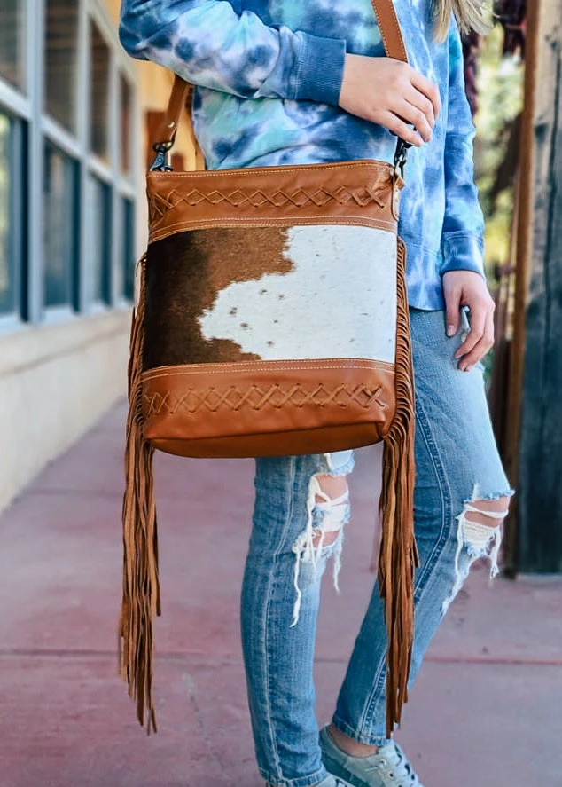 - Elevate your style with the Myra Brown Fringe Cowhide Hobo Handbag. Crafted from high-quality cowhide leather, this handbag offers both durability and a chic, bohemian look.