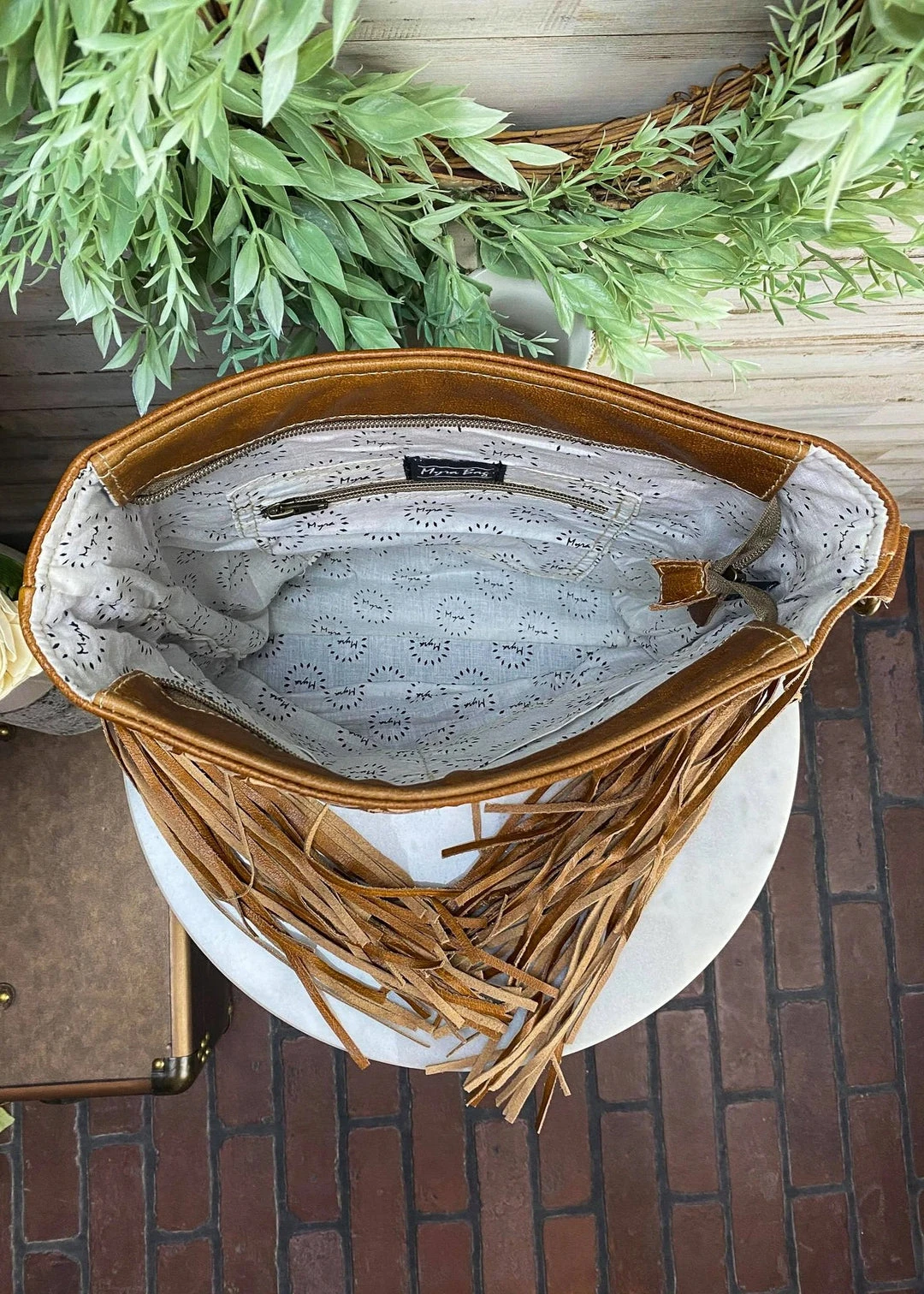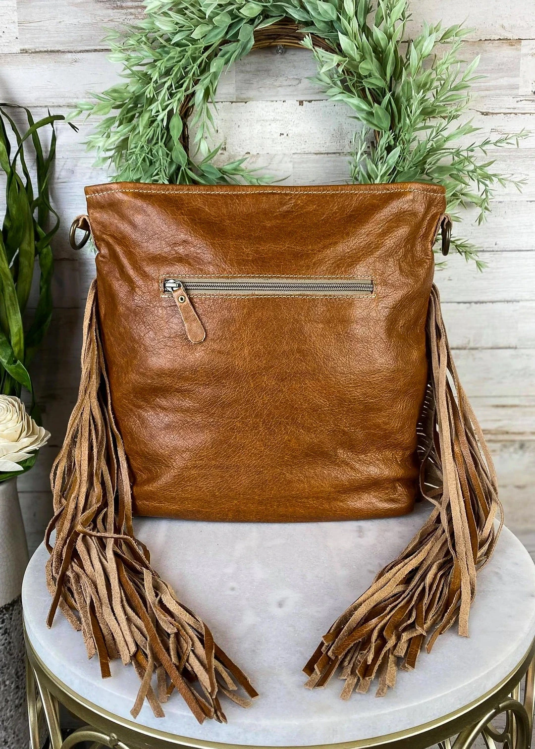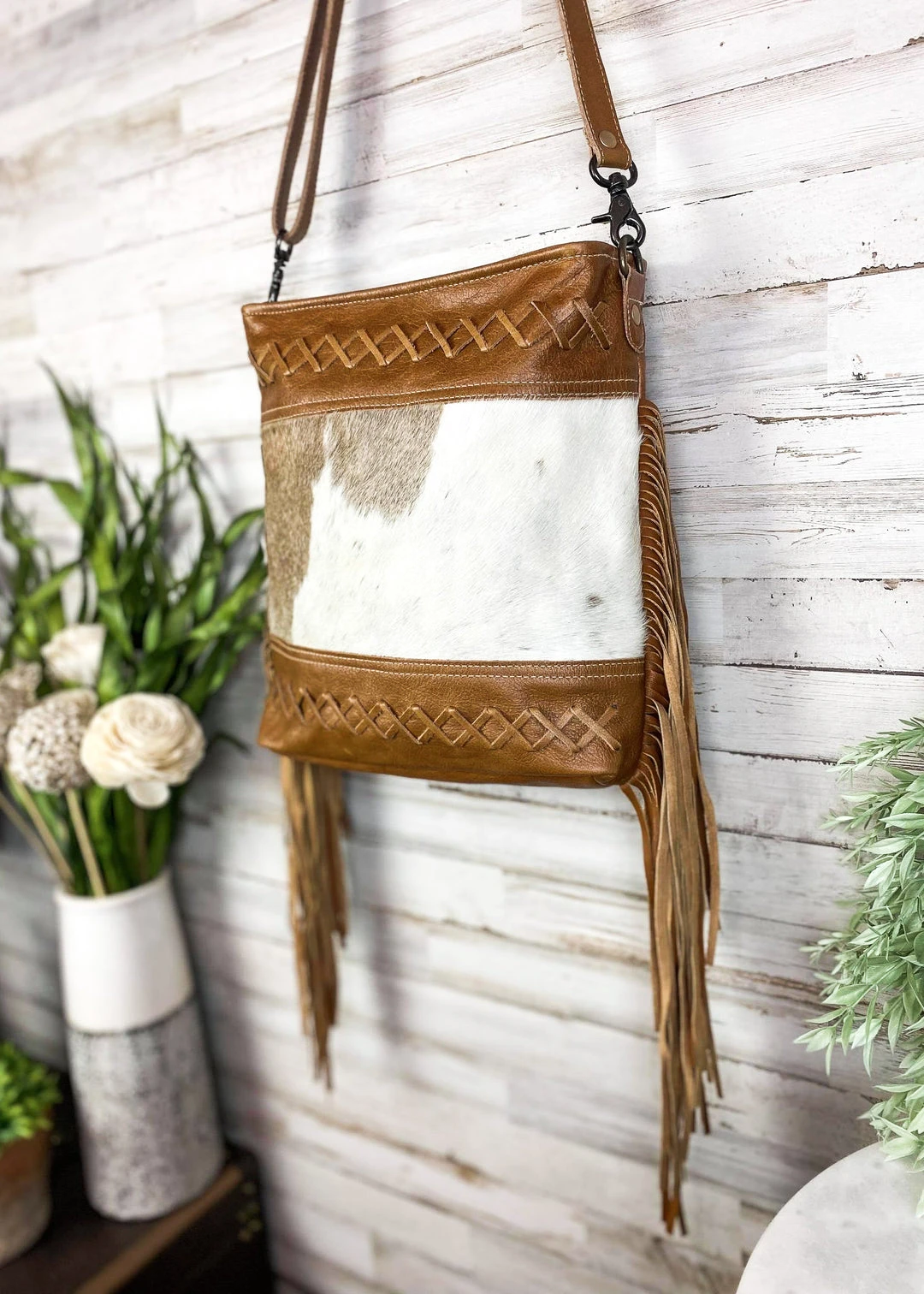 - Elevate your style with the Myra Brown Fringe Cowhide Hobo Handbag. Crafted from high-quality cowhide leather, this handbag offers both durability and a chic, bohemian look.