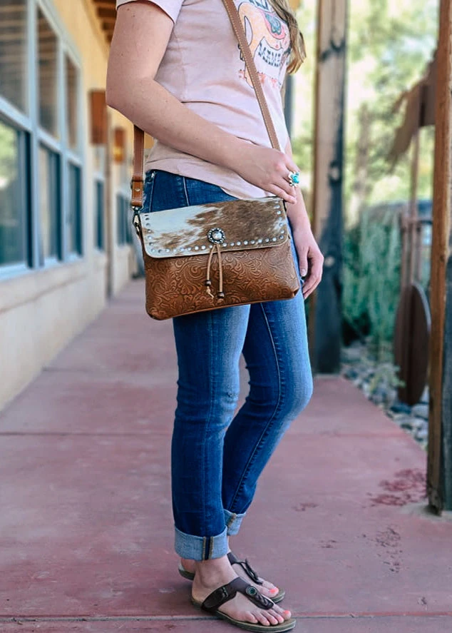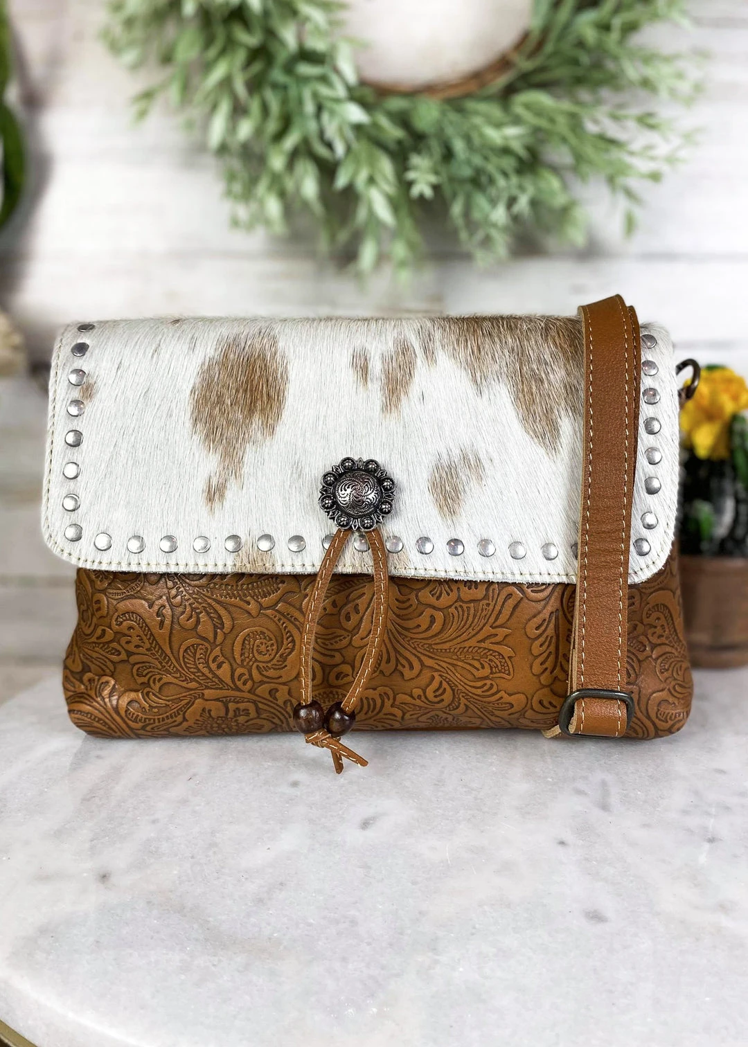 - Crafted with premium brown and white cowhide, the Myra Concho Handbag offers a unique and stylish design that stands out.
