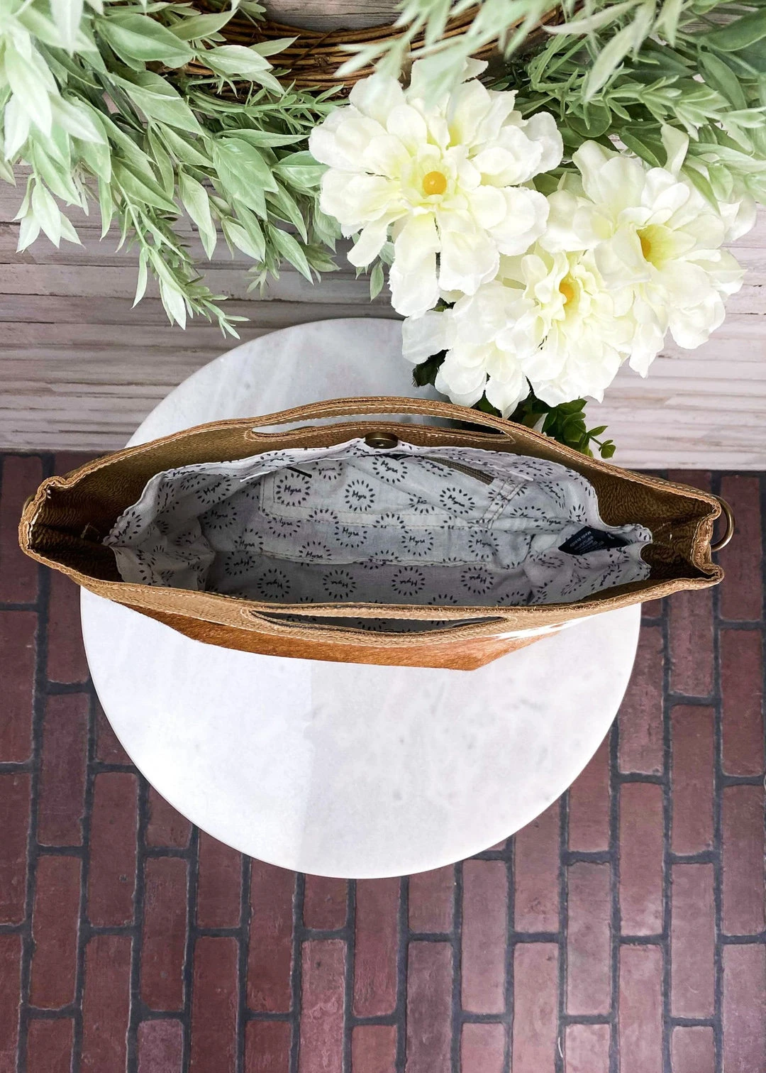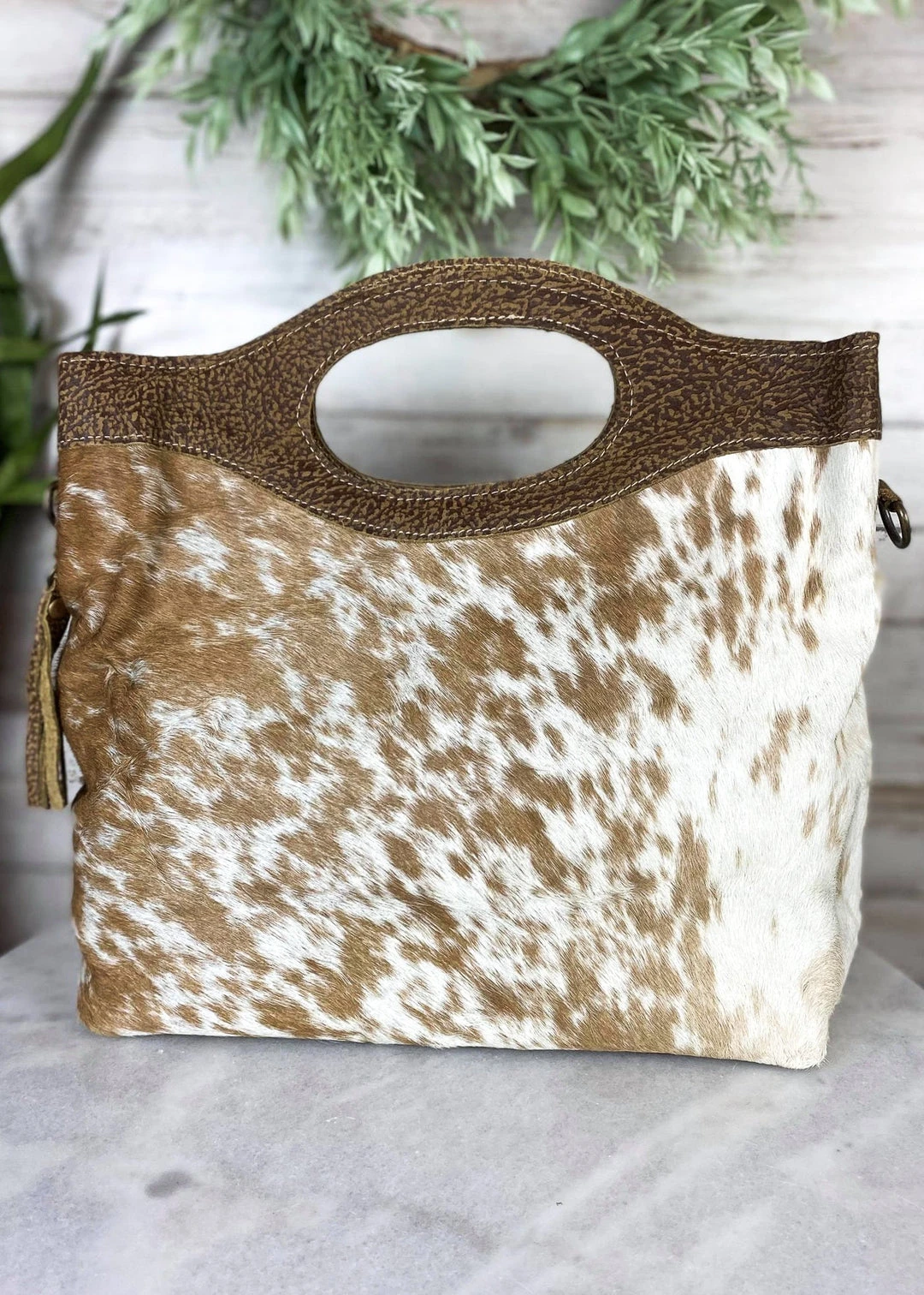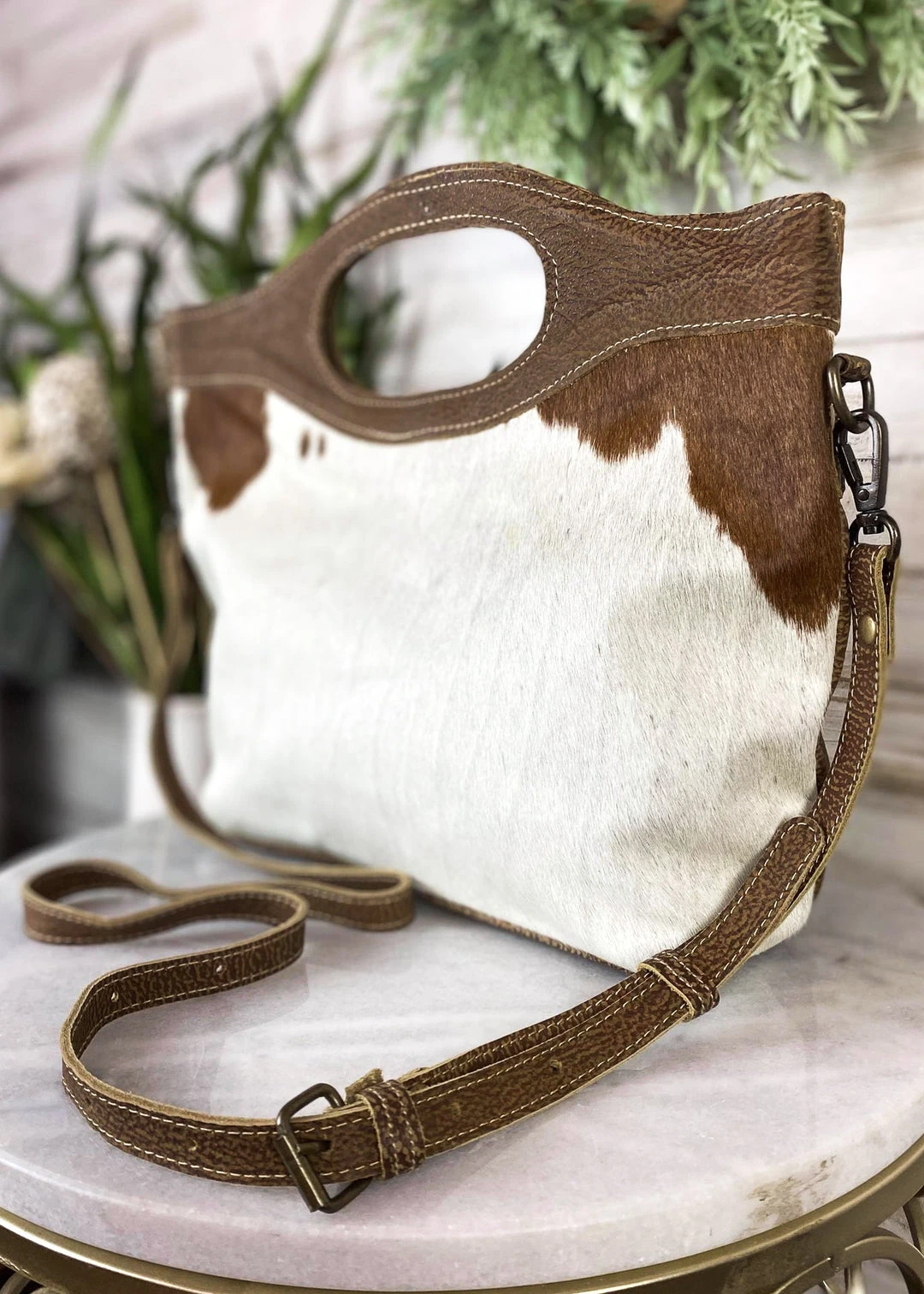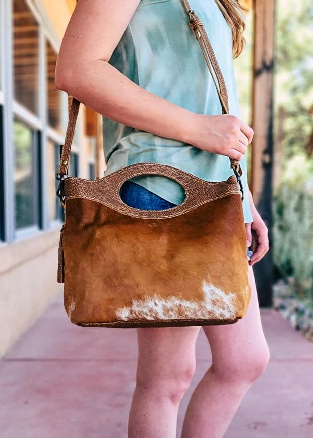 - The Myra Brown & White Cowhide Tote Crossbody Handbag combines elegance with practicality. Its unique cowhide design ensures durability while maintaining a chic appearance.