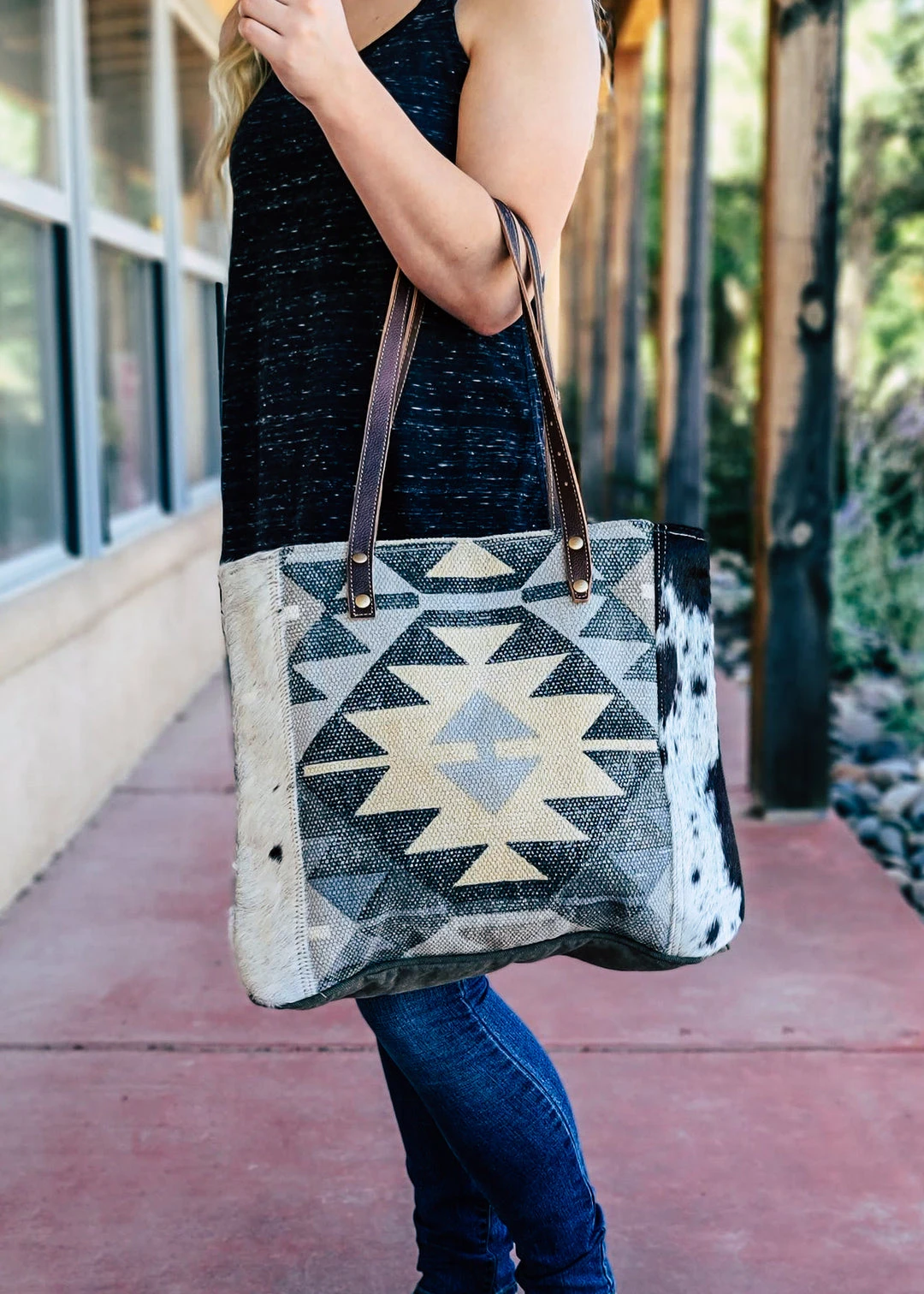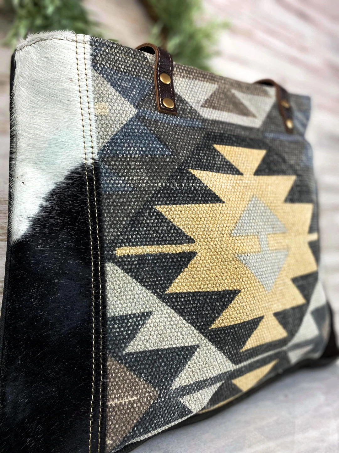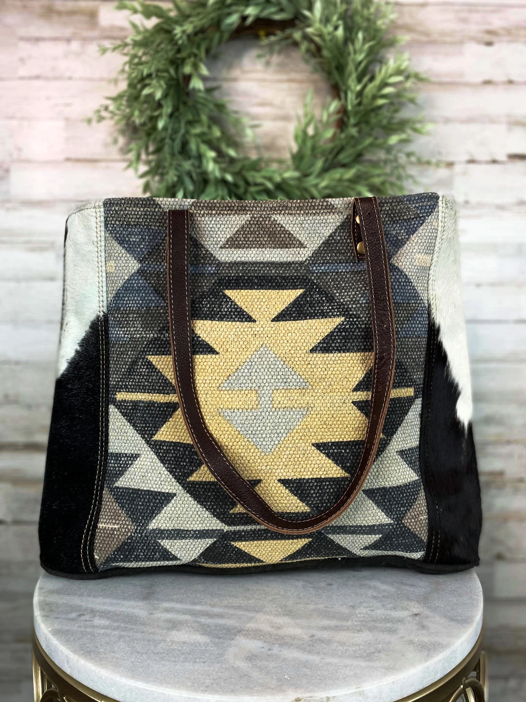 - The Myra Canvas & Cowhide Aztec Tote Handbag combines style and durability with its unique Aztec design. Perfect for any occasion, this handbag is a must-have accessory.
