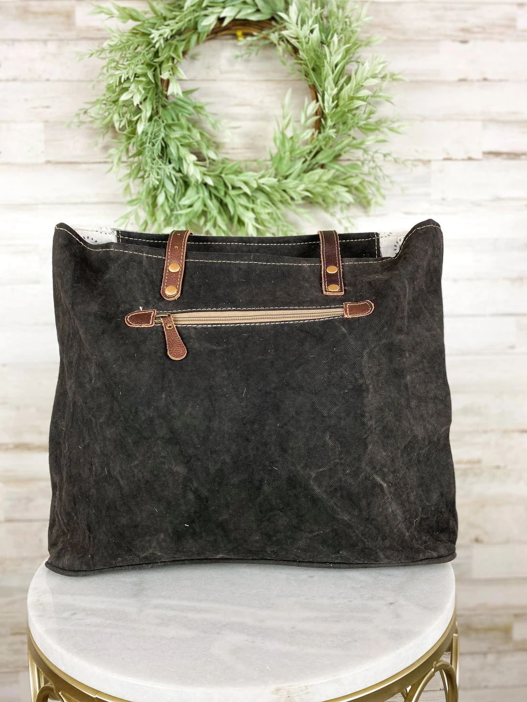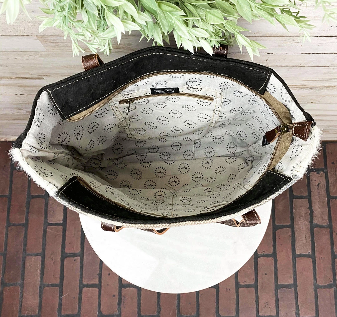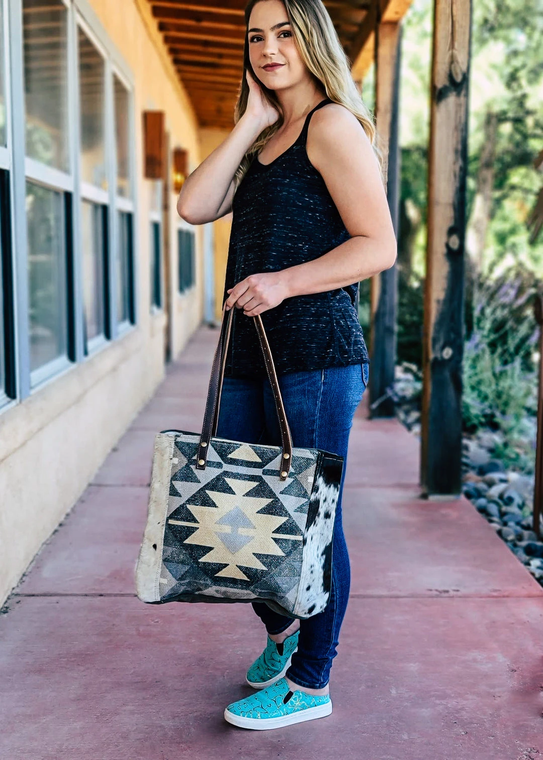 - The Myra Canvas & Cowhide Aztec Tote Handbag combines style and durability with its unique Aztec design. Perfect for any occasion, this handbag is a must-have accessory.