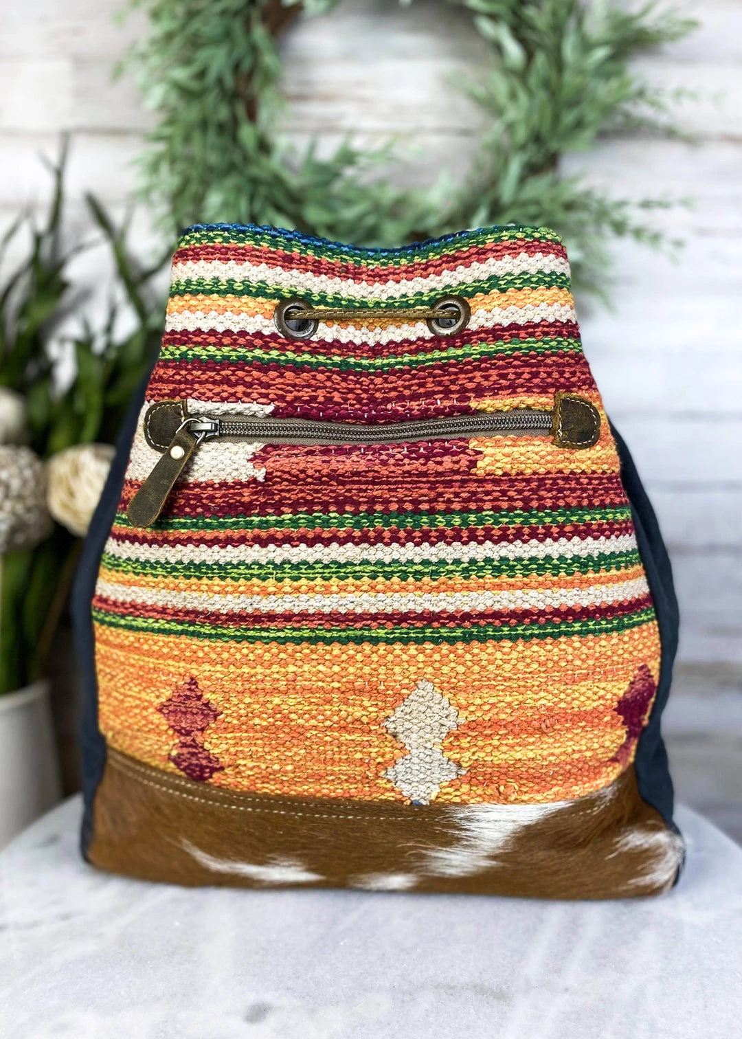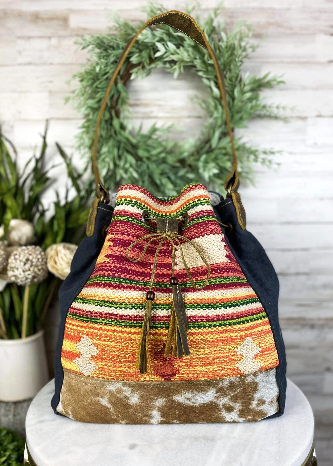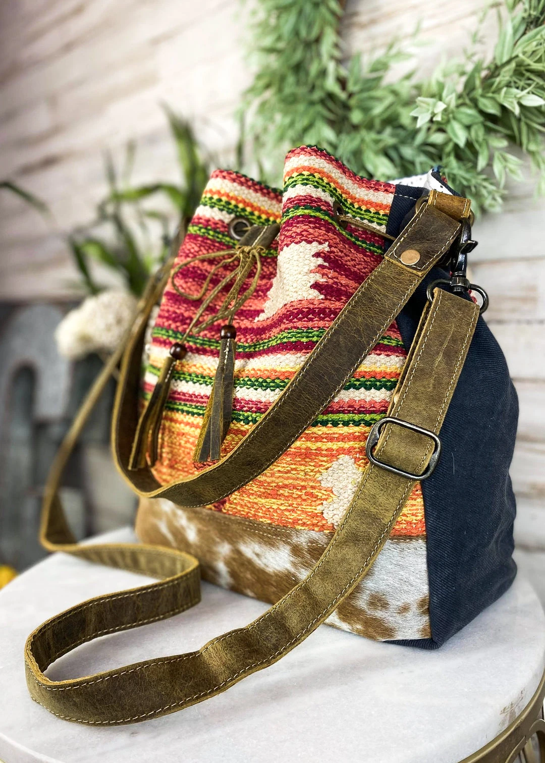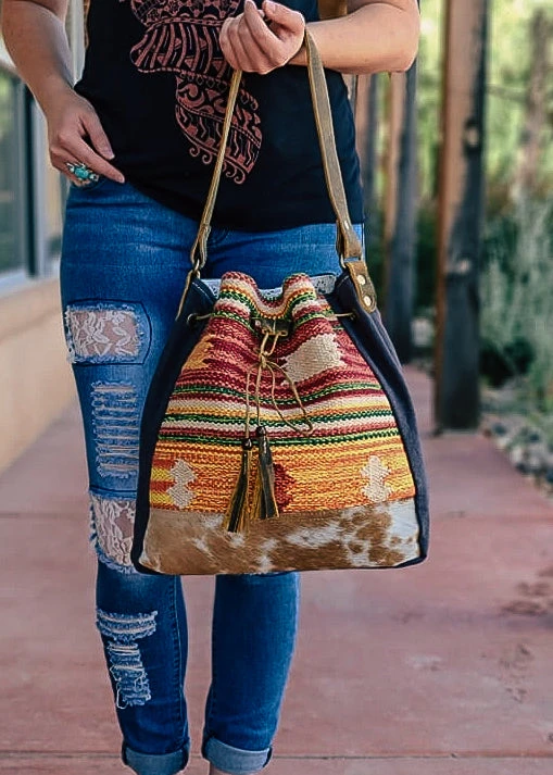 - The Myra Colorful Southwest & Cowhide Bucket Handbag features a vibrant southwest-inspired design, making it a standout accessory for any outfit.