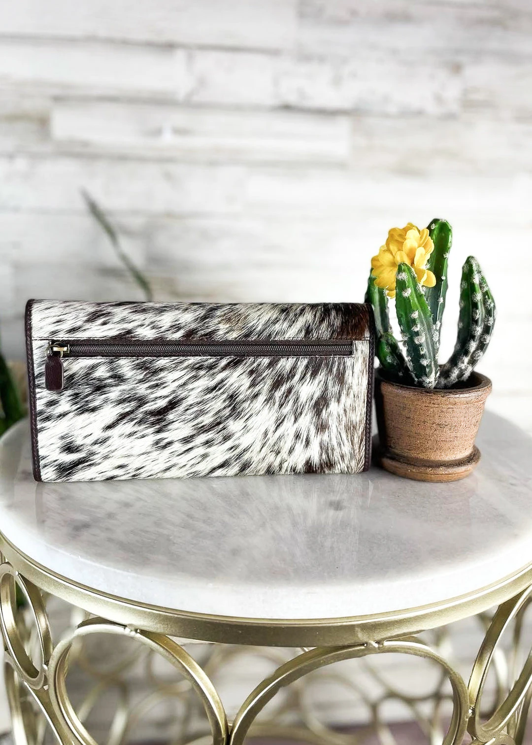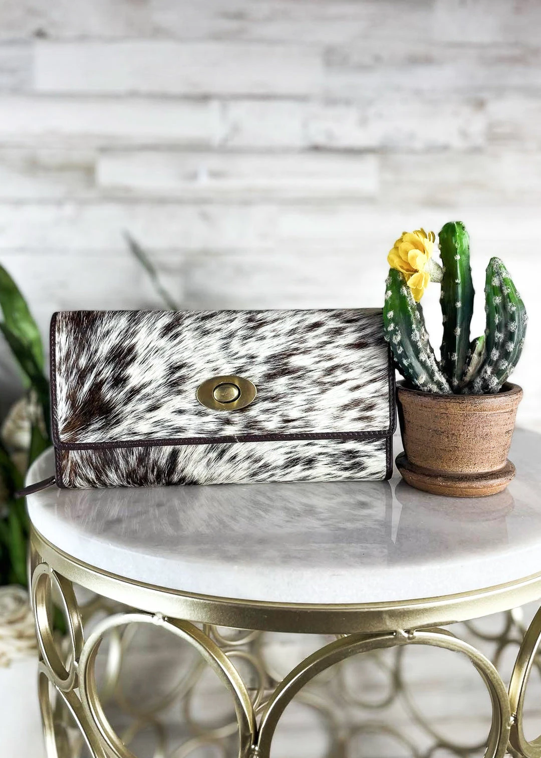 - Elevate your style with the Myra Dark Brown Spotted Twist Lock Cowhide Wallet. Crafted from high-quality cowhide, this wallet offers both durability and a luxurious feel.
